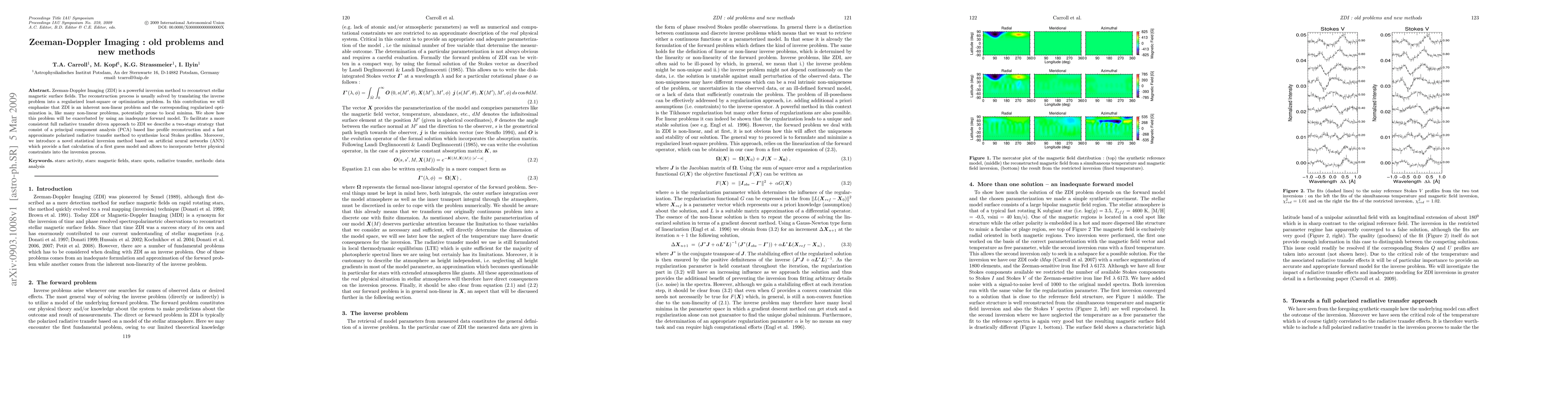 The paper discusses Zeeman-Doppler Imaging (ZDI) for stellar magnetic field reconstruction, highlighting its non-linear nature and susceptibility to local minima due to inadequate forward models. It proposes a two-stage strategy using PCA for line profile reconstruction and an approximate radiative transfer method. Additionally, a novel statistical inversion method based on artificial neural networks is introduced for faster calculation and incorporation of physical constraints.