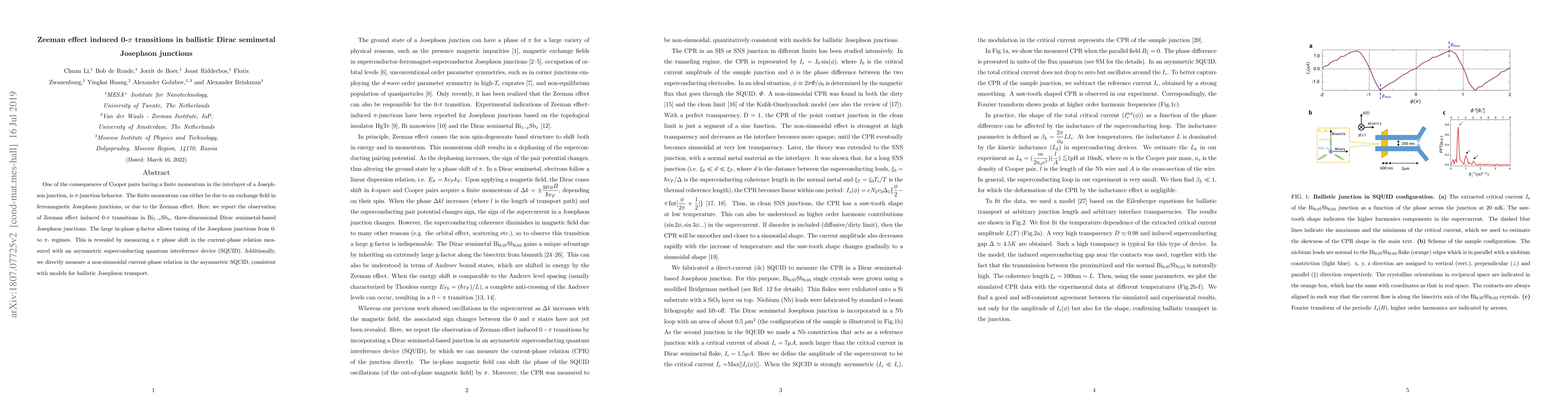 One of the consequences of Cooper pairs having a finite momentum in the interlayer of a Josephson junction, is $\pi$-junction behavior. The finite momentum can either be due to an exchange field in ferromagnetic Josephson junctions, or due to the Zeeman effect. Here, we report the observation of Zeeman effect induced 0-$\pi$ transitions in Bi$_{1-x}$Sb$_x$, 3D Dirac semimetal-based Josephson junctions. The large g-factor of the Zeeman effect from a magnetic field applied in the plane of the junction allows tuning of the Josephson junctions from 0- to $\pi$- regimes. This is revealed by sign changes in the modulation of the critical current by applied magnetic field of an asymmetric superconducting quantum interference device (SQUID). Additionally, we directly measure a non-sinusoidal current-phase relation in the asymmetric SQUID, consistent with models for ballistic Josephson transport.