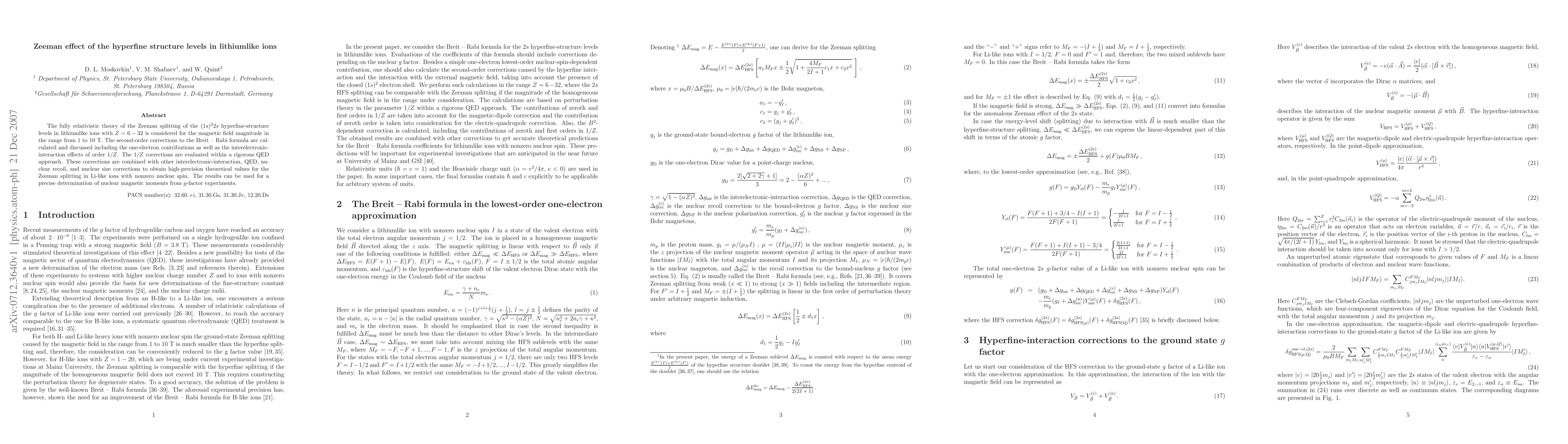 This paper presents a detailed relativistic theory for the Zeeman splitting of hyperfine-structure levels in lithiumlike ions, incorporating second-order corrections and QED effects. The study aims to provide high-precision theoretical values for these ions, useful for determining nuclear magnetic moments through $g$-factor experiments.