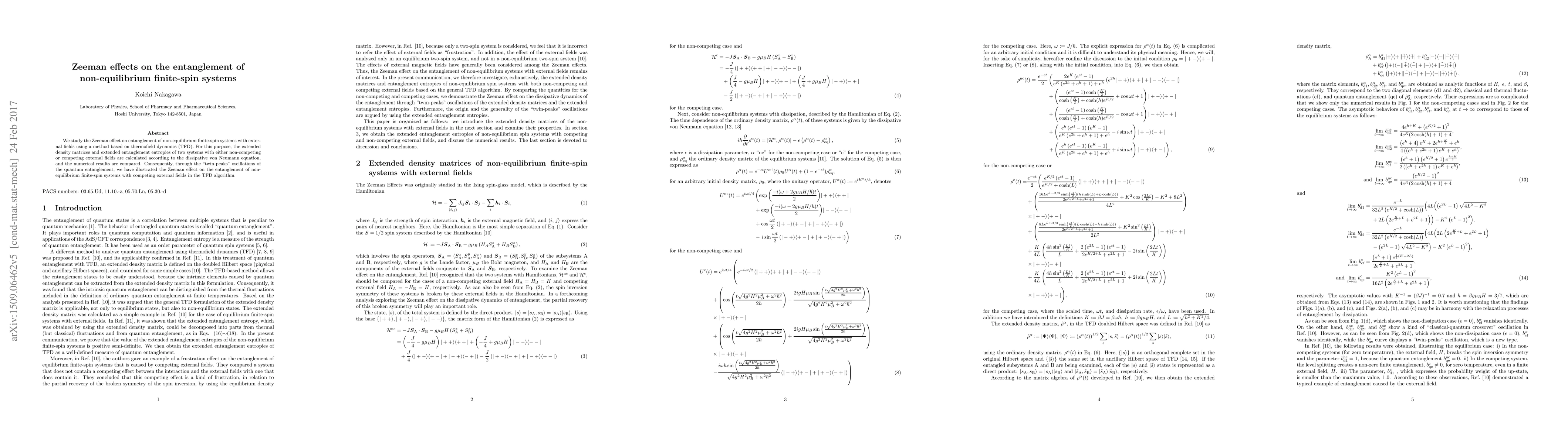This paper investigates the Zeeman effect on the entanglement of non-equilibrium finite-spin systems under external fields using thermofield dynamics (TFD). It reveals "twin-peaks" oscillations in quantum entanglement due to competing external fields, demonstrating the influence of the Zeeman effect in such systems.
