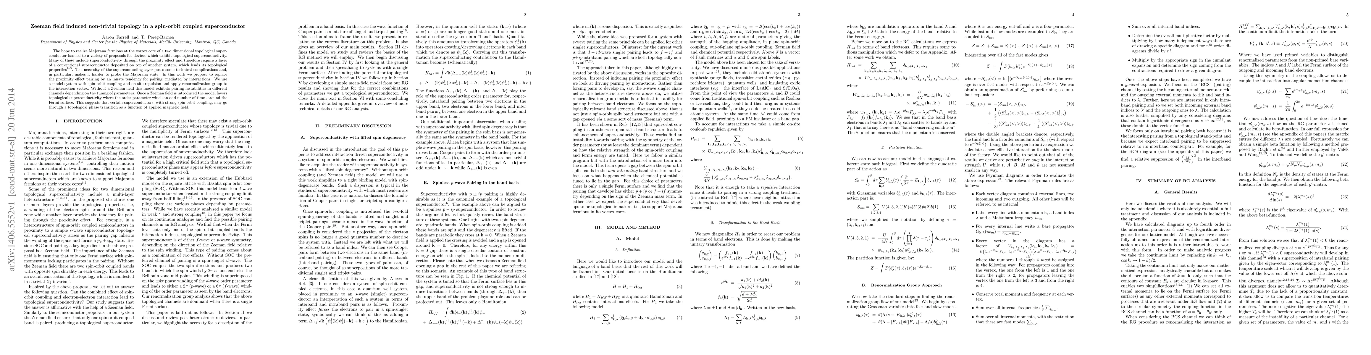 The hope to realize Majorana fermions at the vortex core of a two dimensional topological superconductor has led to a variety of proposals for devices which exhibit topological superconductivity. Many of these include superconductivity through the proximity effect and therefore require a layer of a conventional superconductor deposited on top of another system, which lends its topological properties\cite{Fu,Sau,Alicea}. The necessity of the superconducting layer poses some technical complications and, in particular, makes it harder to probe the Majorana state. In this work we propose to replace the proximity effect pairing by an innate tendency for pairing, mediated by interactions. We use a model system with spin orbit coupling and on-site repulsion and apply renormalization group to the interaction vertex. Without a Zeeman field this model exhibits pairing instabilities in different channels depending on the tuning of parameters. Once a Zeeman field is introduced the model favors topological superconductivity where the order parameter winds an odd number of times around the Fermi surface. This suggests that certain superconductors, with strong spin-orbit coupling, may go through a topological phase transition as a function of applied magnetic field.