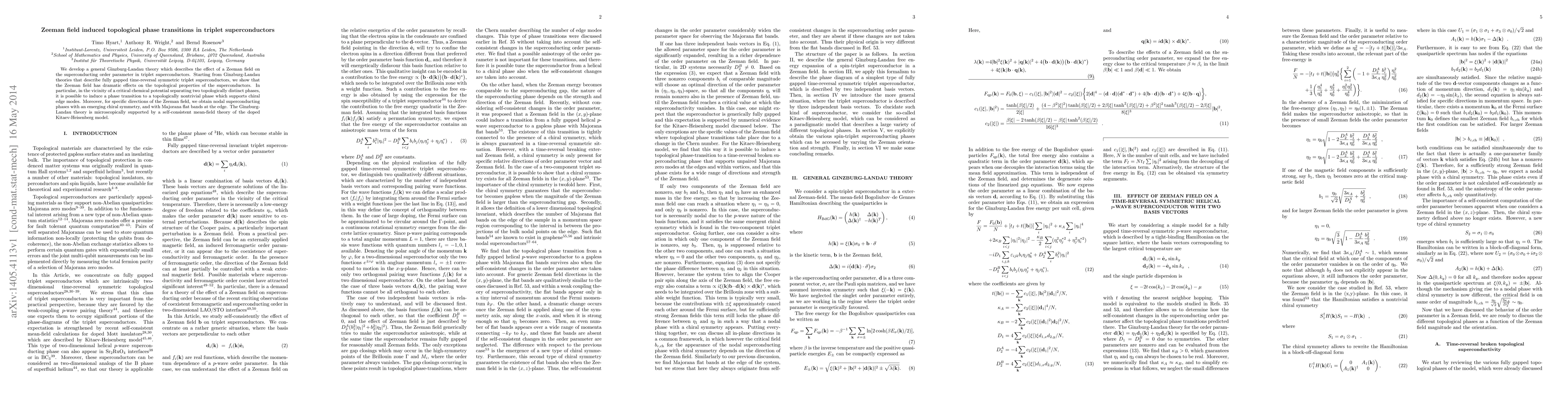 This paper develops a Ginzburg-Landau theory to describe how a Zeeman field influences the superconducting order parameter in triplet superconductors, revealing significant topological phase transitions. It shows that a Zeeman field can induce a transition to a topologically nontrivial phase with chiral edge modes, and can also create nodal phases with Majorana flat bands under specific field orientations.