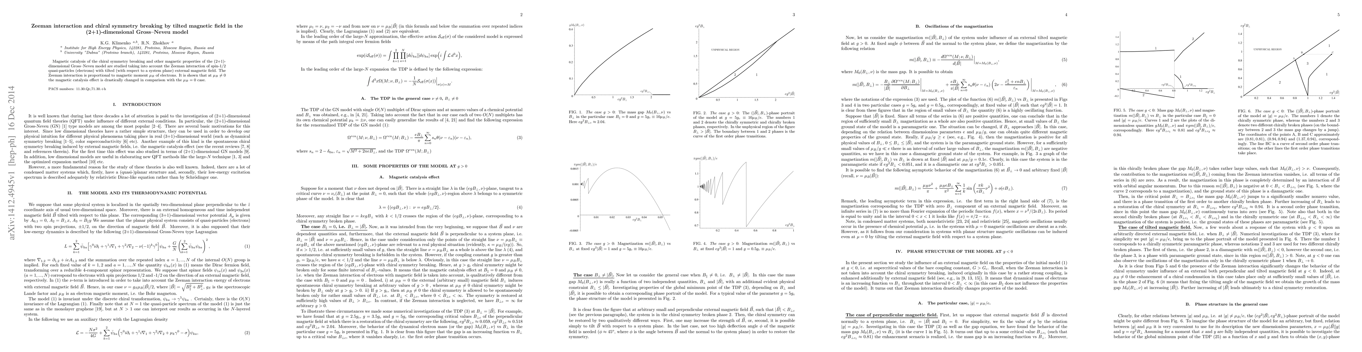 Magnetic catalysis of the chiral symmetry breaking and other magnetic properties of the (2+1)-dimensional Gross--Neveu model are studied taking into account the Zeeman interaction of spin-1/2 quasi-particles (electrons) with tilted (with respect to a system plane) external magnetic field. The Zeeman interaction is proportional to magnetic moment $\mu_B$ of electrons. It is shown that at $\mu_B\ne 0$ the magnetic catalysis effect is drastically changed in comparison with the $\mu_B= 0$ case.
