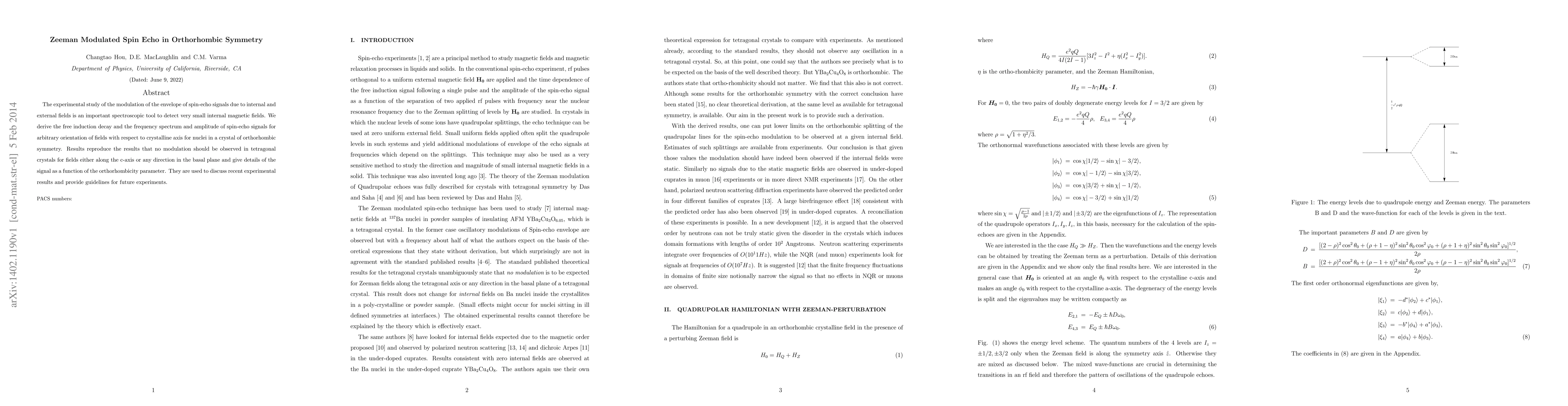 The experimental study of the modulation of the envelope of spin-echo signals due to internal and external fields is an important spectroscopic tool to detect very small internal magnetic fields. We derive the free induction decay and the frequency spectrum and amplitude of spin-echo signals for arbitrary orientation of fields with respect to crystalline axis for nuclei in a crystal of orthorhombic symmetry. Results reproduce the results that no modulation should be observed in tetragonal crystals for fields either along the c-axis or any direction in the basal plane and give details of the signal as a function of the orthorhombicity parameter. They are used to discuss recent experimental results and provide guidelines for future experiments.
