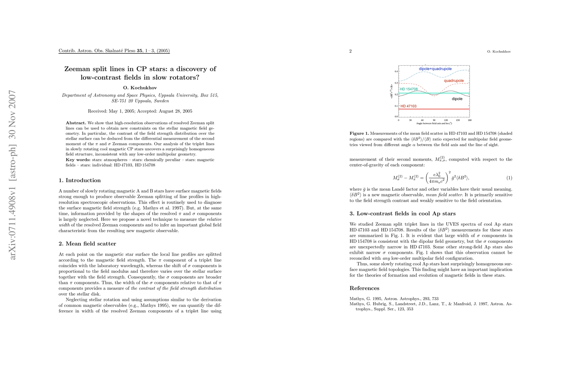 We show that high-resolution observations of resolved Zeeman split lines can be used to obtain new constraints on the stellar magnetic field geometry. In particular, the contrast of the field strength distribution over the stellar surface can be deduced from the differential measurement of the second moment of the pi and sigma Zeeman components. Our analysis of the triplet lines in slowly rotating cool magnetic CP stars uncovers a surprisingly homogeneous field structure, inconsistent with any low-order multipolar geometry.