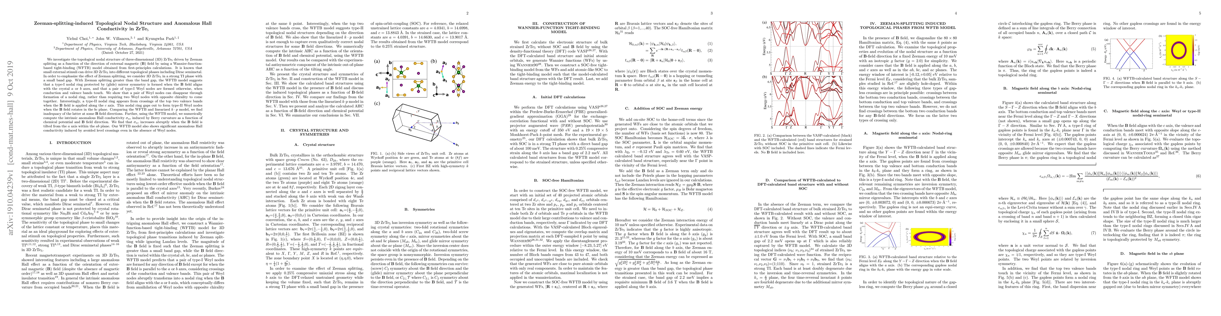 This paper examines the topological nodal structure in 3D ZrTe$_5$ under Zeeman splitting using a Wannier-function-based tight-binding model, revealing type-I nodal rings and Weyl nodes influenced by the direction of the magnetic field. It also highlights significant anomalous Hall conductivity effects linked to Berry curvature and avoided level crossings.
