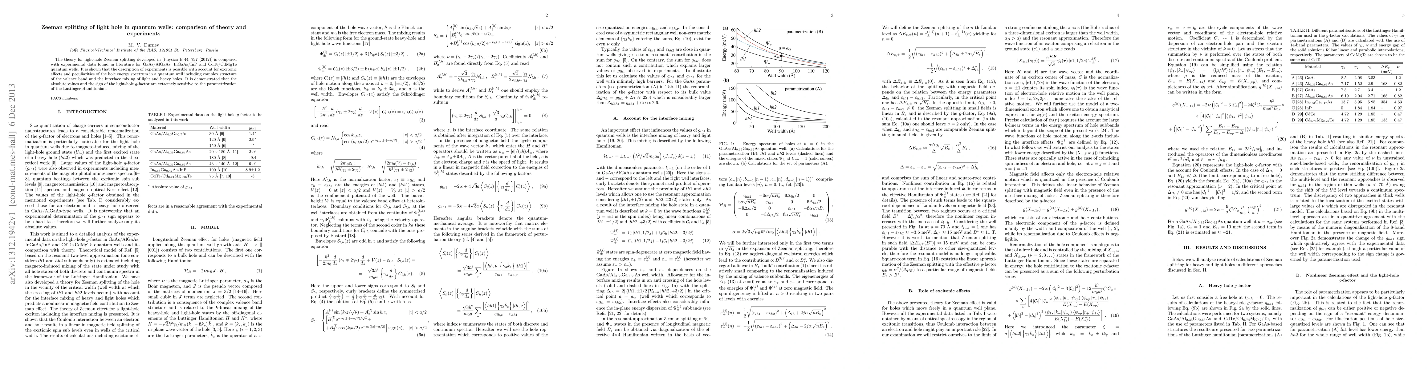 Researchers compared theoretical models of light-hole Zeeman splitting with experimental data from quantum wells in GaAs/AlGaAs, InGaAs/InP, and CdTe/CdMgTe materials, finding that the theory can accurately describe experiments when accounting for excitonic effects.