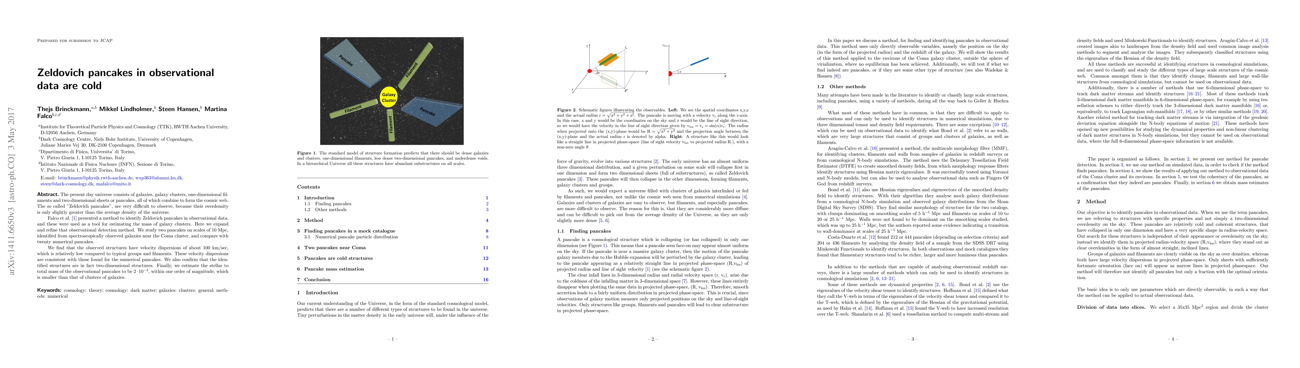 The present day universe consists of galaxies, galaxy clusters, one-dimensional filaments and two-dimensional sheets or pancakes, all of which combine to form the cosmic web. The so called "Zeldovich pancakes", are very difficult to observe, because their overdensity is only slightly greater than the average density of the universe. Falco et al (2014) presented a method to identify Zeldovich pancakes in observational data, and these were used as a tool for estimating the mass of galaxy clusters. Here we expand and refine that observational detection method. We study two pancakes on scales of 10 Mpc, identified from spectroscopically observed galaxies near the Coma cluster, and compare with twenty numerical pancakes. We find that the observed structures have velocity dispersion about 100 km/sec, which is relatively low compared to typical groups and filaments. These velocity dispersions are consistent with those found for the numerical pancakes. We also confirm that the identified structures are in fact two-dimensional structures. Finally, we estimate the stellar to total mass of the observational pancakes to be $2 \times 10^{-4}$, within one order of magnitude, which is smaller than that of clusters of galaxies.