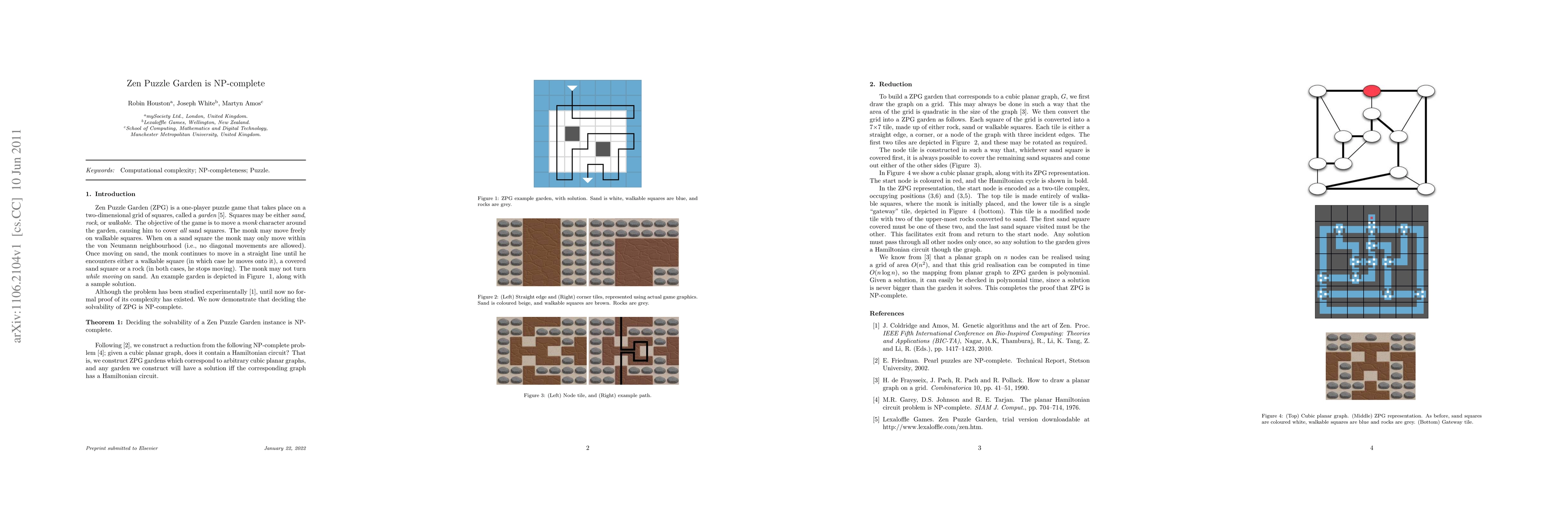 Zen Puzzle Garden (ZPG) is a one-player puzzle game. In this paper, we prove that deciding the solvability of ZPG is NP-complete.