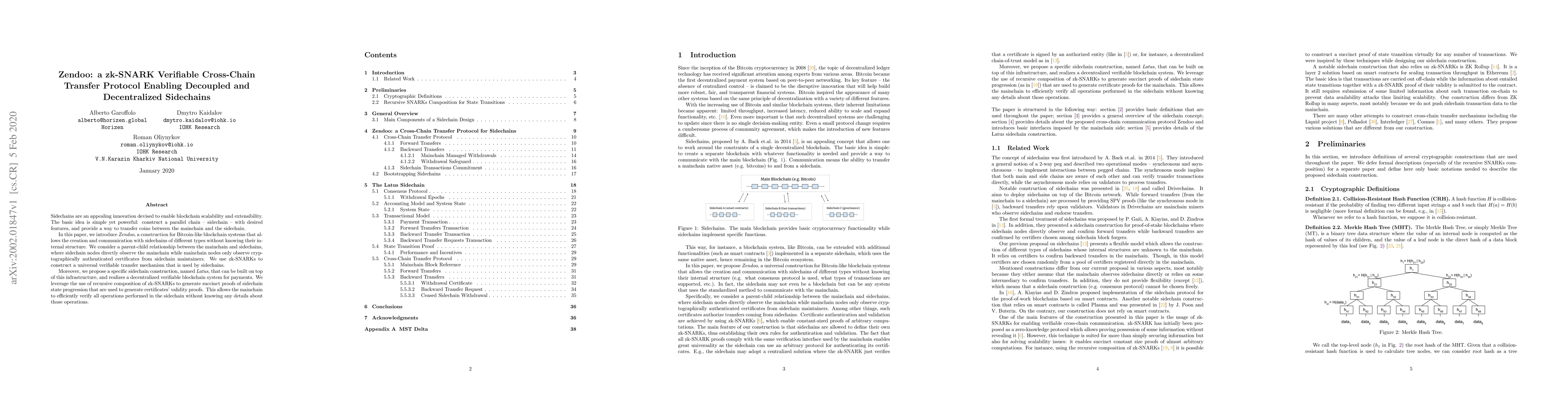 Zendoo introduces a zk-SNARK verifiable cross-chain protocol for Bitcoin-like blockchains, enabling decentralized sidechains to communicate with the mainchain without revealing internal details. It proposes Latus, a specific sidechain built on this framework, using recursive zk-SNARKs for efficient verification of sidechain operations.