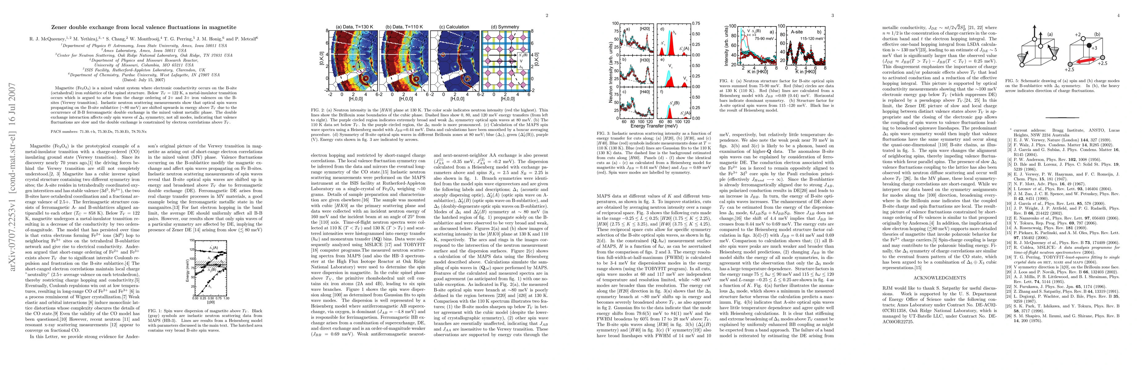 Magnetite (Fe$_{3}$O$_{4}$) is a mixed valent system where electronic conductivity occurs on the B-site (octahedral) iron sublattice of the spinel structure. Below $T_{V}=122$ K, a metal-insulator transition occurs which is argued to arise from the charge ordering of 2+ and 3+ iron valences on the B-sites (Verwey transition). Inelastic neutron scattering measurements show that optical spin waves propagating on the B-site sublattice ($\sim$80 meV) are shifted upwards in energy above $T_{V}$ due to the occurrence of B-B ferromagnetic double exchange in the mixed valent metallic phase. The double exchange interaction affects only spin waves of $\Delta_{5}$ symmetry, not all modes, indicating that valence fluctuations are slow and the double exchange is constrained by electron correlations above $T_{V}$.