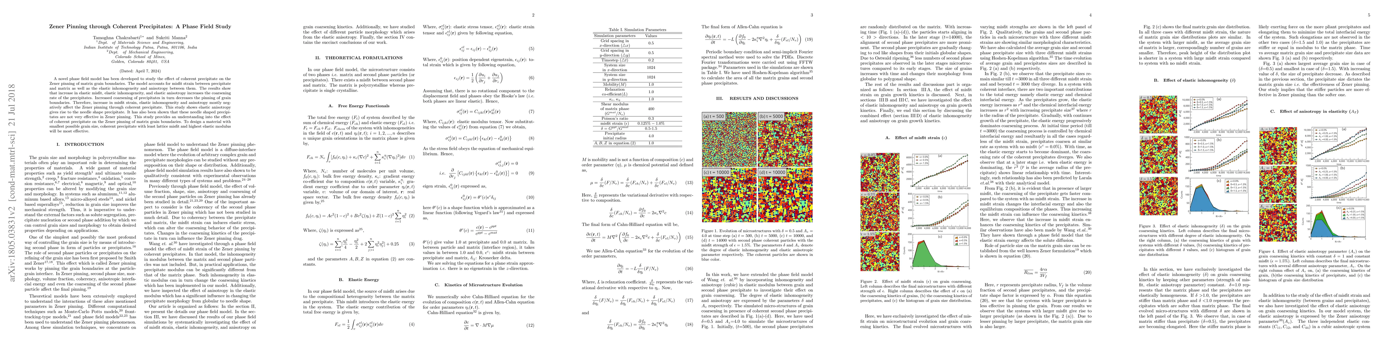 A phase field model shows that coherent precipitates increase coarsening of matrix grain boundaries, decreasing Zener pinning, and prefer needle-shaped precipitates with lower effectiveness in pinning.