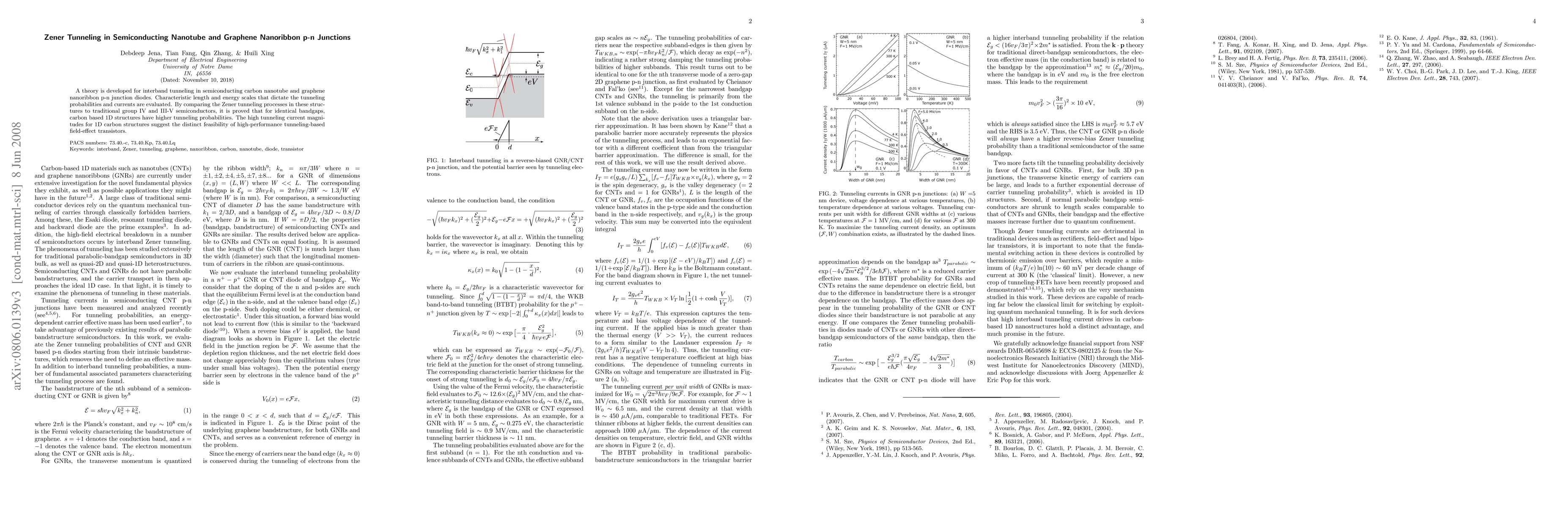 The paper presents a comprehensive theoretical analysis of interband Zener tunneling in semiconducting CNT and GNR p-n junction diodes, evaluating tunneling probabilities and associated parameters from intrinsic band structures without the need for an effective mass.