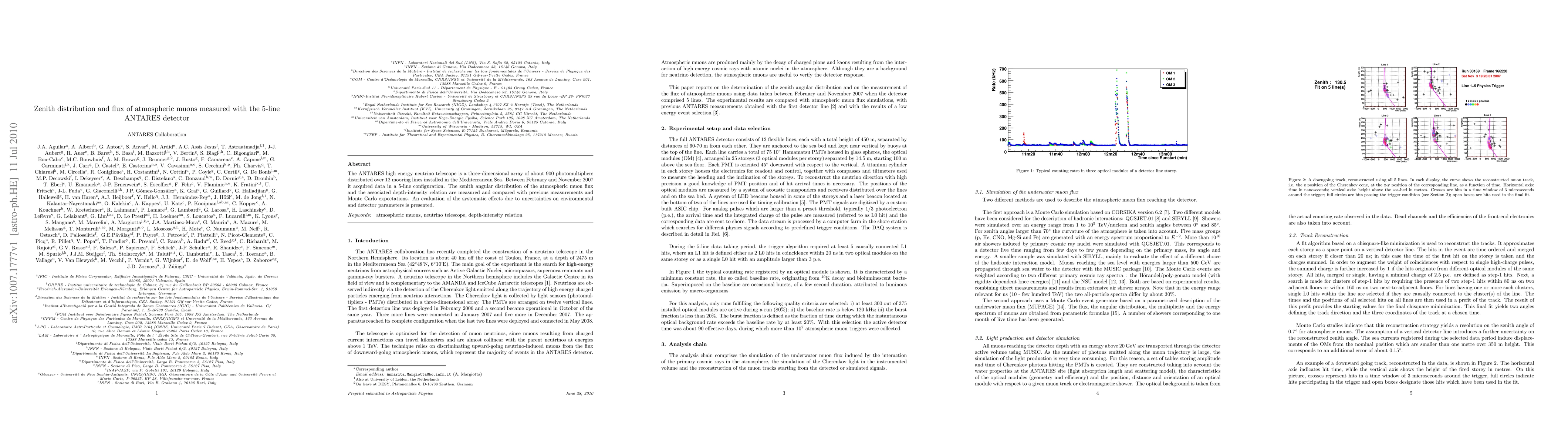 The ANTARES detector in a 5-line configuration measured the zenith distribution and flux of atmospheric muons in the Mediterranean Sea, comparing results with previous measurements and Monte Carlo simulations, and evaluating systematic uncertainties.