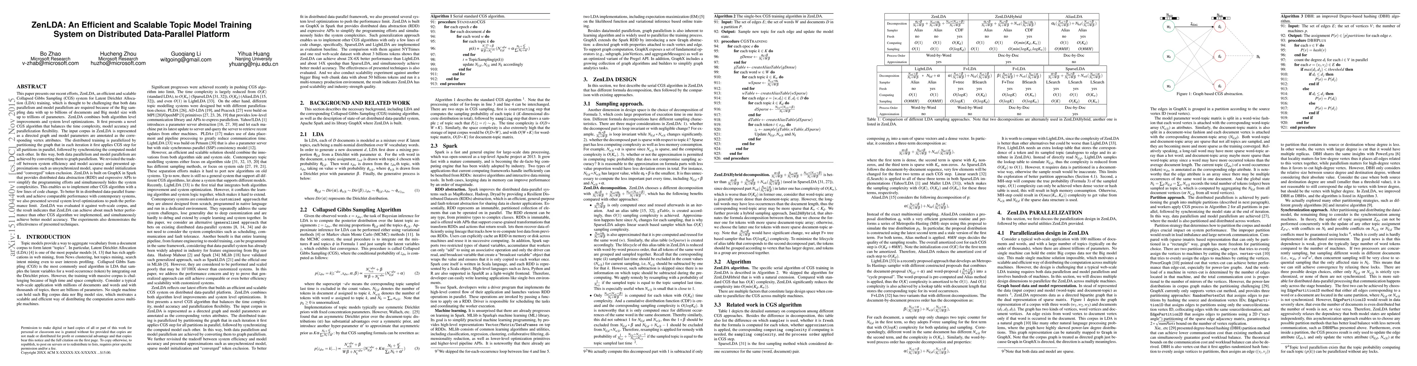 This paper presents our recent efforts, zenLDA, an efficient and scalable Collapsed Gibbs Sampling system for Latent Dirichlet Allocation training, which is thought to be challenging that both data parallelism and model parallelism are required because of the Big sampling data with up to billions of documents and Big model size with up to trillions of parameters. zenLDA combines both algorithm level improvements and system level optimizations. It first presents a novel CGS algorithm that balances the time complexity, model accuracy and parallelization flexibility. The input corpus in zenLDA is represented as a directed graph and model parameters are annotated as the corresponding vertex attributes. The distributed training is parallelized by partitioning the graph that in each iteration it first applies CGS step for all partitions in parallel, followed by synchronizing the computed model each other. In this way, both data parallelism and model parallelism are achieved by converting them to graph parallelism. We revisited the tradeoff between system efficiency and model accuracy and presented approximations such as unsynchronized model, sparse model initialization and "converged" token exclusion. zenLDA is built on GraphX in Spark that provides distributed data abstraction (RDD) and expressive APIs to simplify the programming efforts and simultaneously hides the system complexities. This enables us to implement other CGS algorithm with a few lines of code change. To better fit in distributed data-parallel framework and achieve comparable performance with contemporary systems, we also presented several system level optimizations to push the performance limit. zenLDA was evaluated it against web-scale corpus, and the result indicates that zenLDA can achieve about much better performance than other CGS algorithm we implemented, and simultaneously achieve better model accuracy.