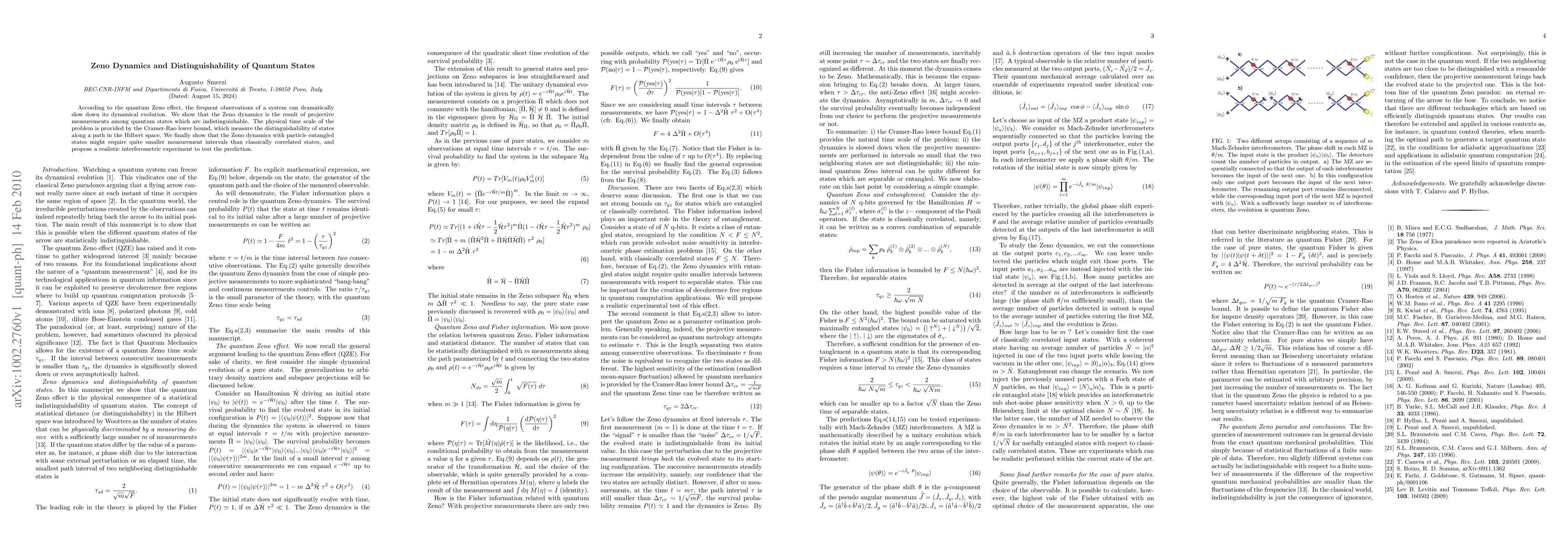 This paper explores the quantum Zeno effect, demonstrating that frequent observations slow down system evolution due to projective measurements of indistinguishable states. The Cramer-Rao lower bound is used to quantify state distinguishability, revealing that entangled states may require shorter measurement intervals than classically correlated states, with an interferometric experiment proposed for testing this prediction.