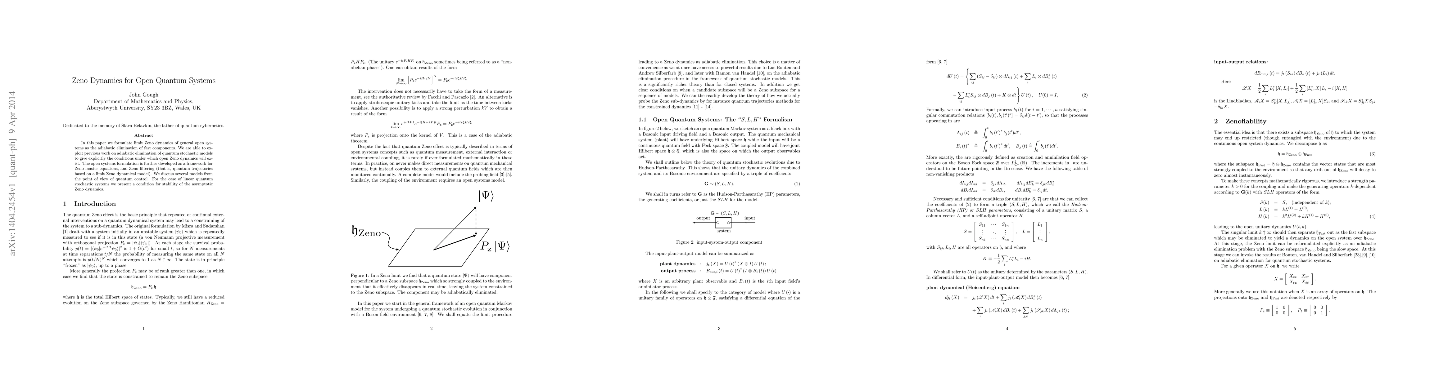 The paper presents a comprehensive formulation of Zeno dynamics for open quantum systems, including conditions for existence, master equations, and filtering, based on adiabatic elimination of fast components.
