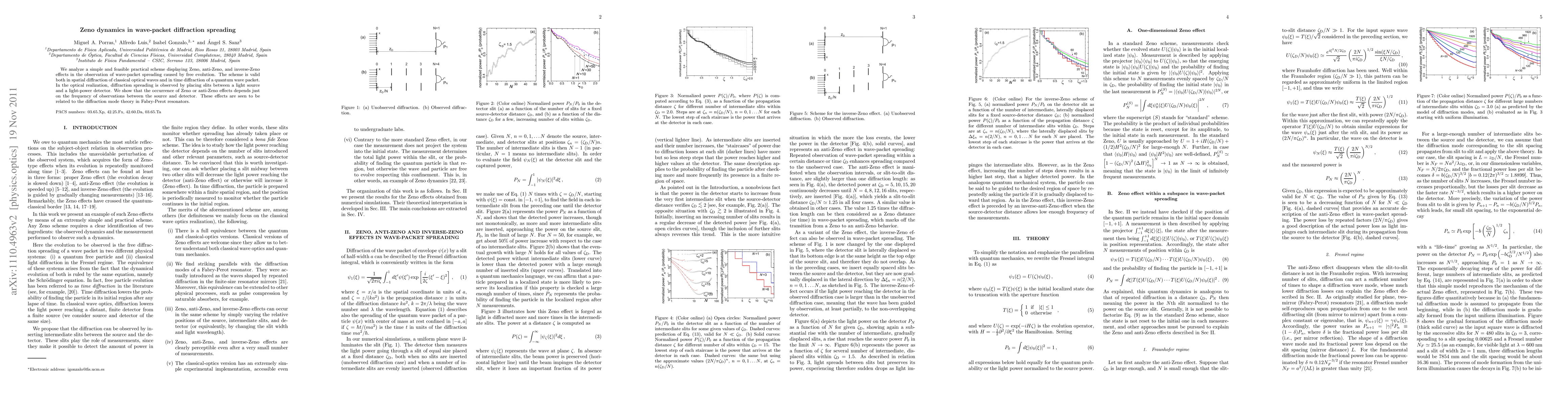 We analyze a simple and feasible practical scheme displaying Zeno, anti-Zeno, and inverse-Zeno effects in the observation of wave-packet spreading caused by free evolution. The scheme is valid both in spatial diffraction of classical optical waves and in time diffraction of a quantum wave packet. In the optical realization, diffraction spreading is observed by placing slits between a light source and a light-power detector. We show that the occurrence of Zeno or anti-Zeno effects depends just on the frequency of observations between the source and detector. These effects are seen to be related to the diffraction mode theory in Fabry-Perot resonators.