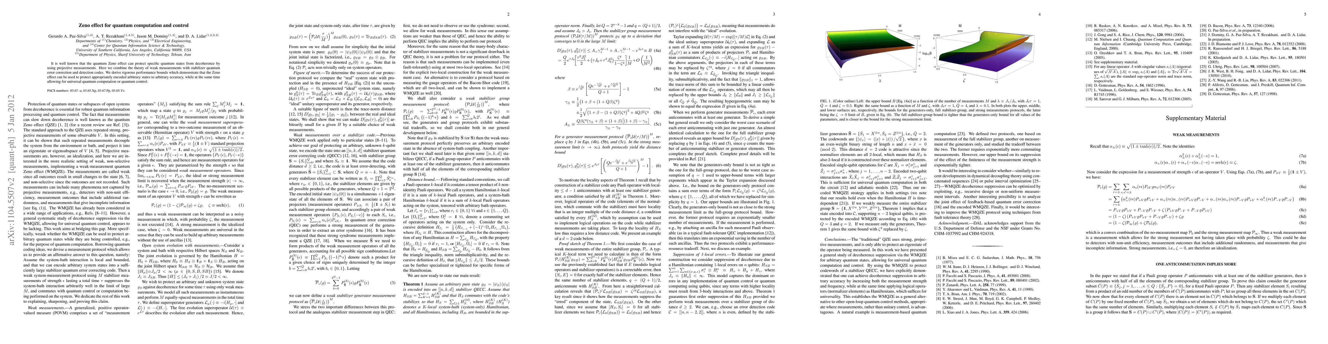 The paper explores the quantum Zeno effect to protect quantum states against decoherence through projective measurements, combining it with weak measurements and stabilizer codes for quantum error correction, and establishing performance bounds for its use in universal quantum computation. The derived bounds show the potential for protecting encoded states to any accuracy while facilitating quantum control.