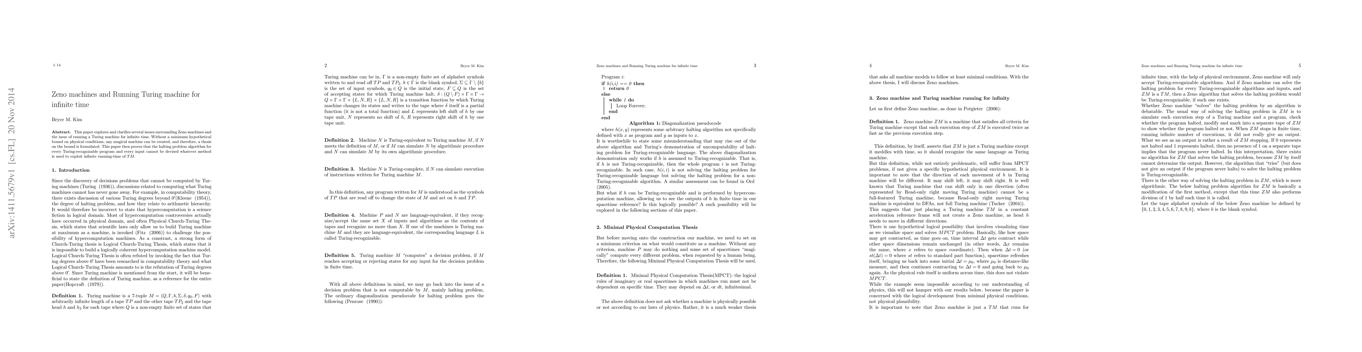 This paper explores and clarifies several issues surrounding Zeno machines and the issue of running a Turing machine for infinite time. Without a minimum hypothetical bound on physical conditions, any magical machine can be created, and therefore, a thesis on the bound is formulated. This paper then proves that the halting problem algorithm for every Turing-recognizable program and every input cannot be devised whatever method is used to exploit infinite running-time of Turing machine.