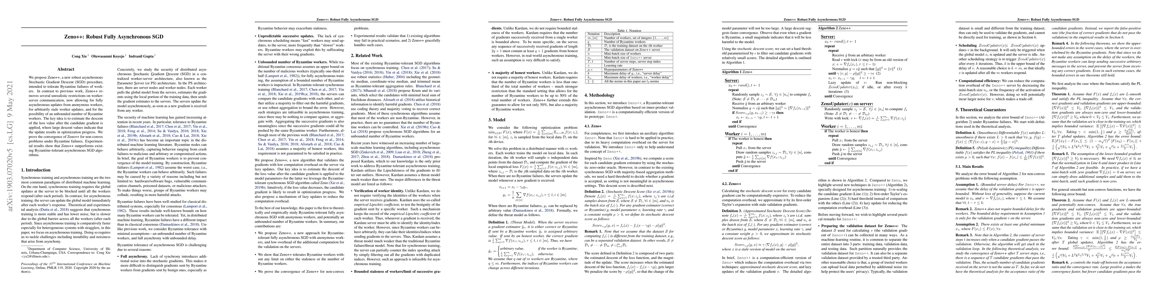 Zeno++: A new robust asynchronous Stochastic Gradient Descent procedure that can tolerate Byzantine failures of workers, outperforming existing approaches in non-convex optimization problems.