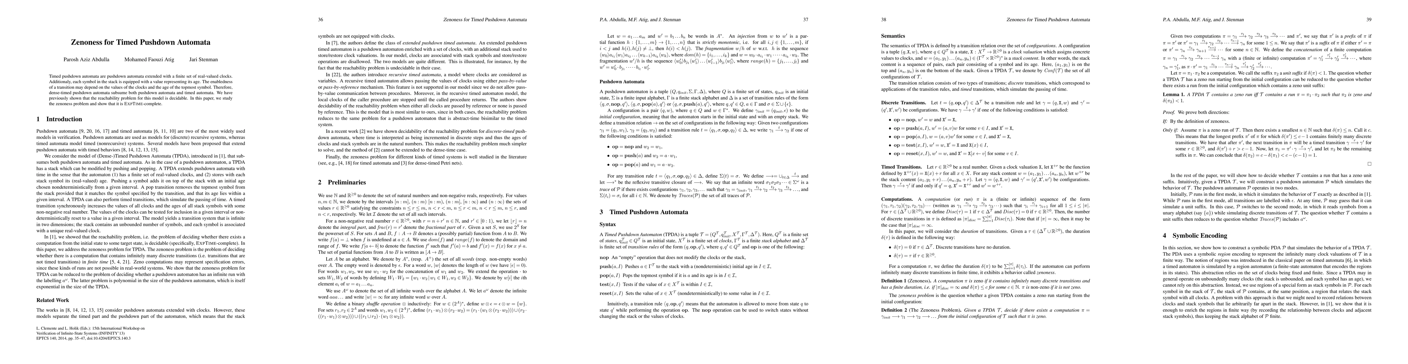 Timed pushdown automata are pushdown automata extended with a finite set of real-valued clocks. Additionaly, each symbol in the stack is equipped with a value representing its age. The enabledness of a transition may depend on the values of the clocks and the age of the topmost symbol. Therefore, dense-timed pushdown automata subsume both pushdown automata and timed automata. We have previously shown that the reachability problem for this model is decidable. In this paper, we study the zenoness problem and show that it is EXPTIME-complete.