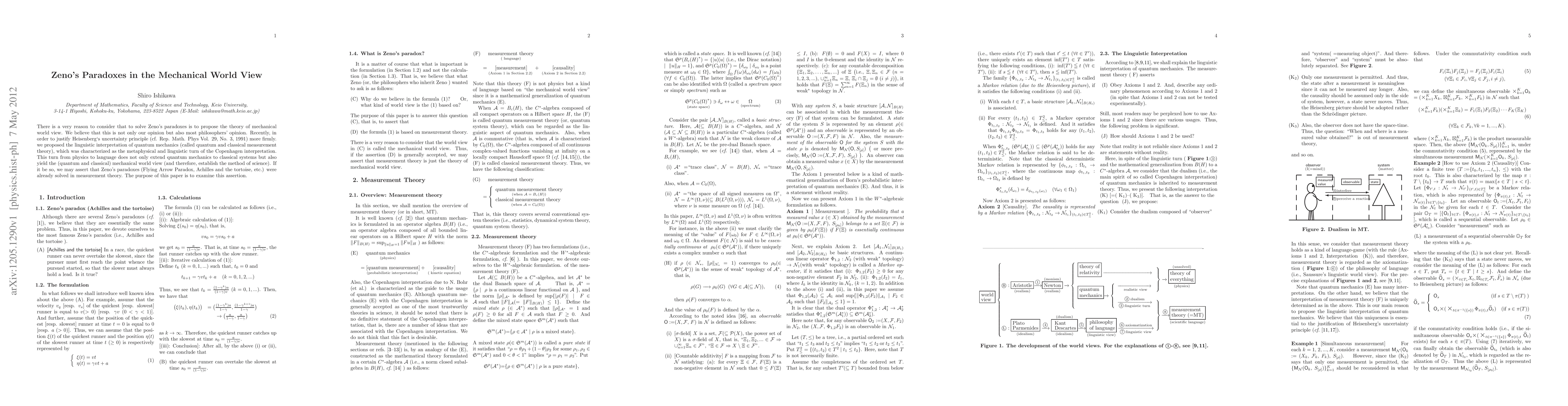 There is a very reason to consider that to solve Zeno's paradoxes is to propose the theory of mechanical world view. We believe that this is not only our opinion but also most philosophers' opinion. Recently, in order to justify Heisenberg`s uncertainty principle (cf. Rep. Math. Phys Vol. 29, No. 3, 1991) more firmly. we proposed the linguistic interpretation of quantum mechanics (called quantum and classical measurement theory), which was characterized as the metaphysical and linguistic turn of the Copenhagen interpretation. This turn from physics to language does not only extend quantum mechanicsto classical systems but also yield the (quantum and classical) mechanical world view (and therefore, establish the method of science). If it be so, we may assert that Zeno's paradoxes (Flying Arrow Paradox, Achilles and the tortoise, etc.) were already solved in measurement theory. The purpose of this paper is to examine this assertion.