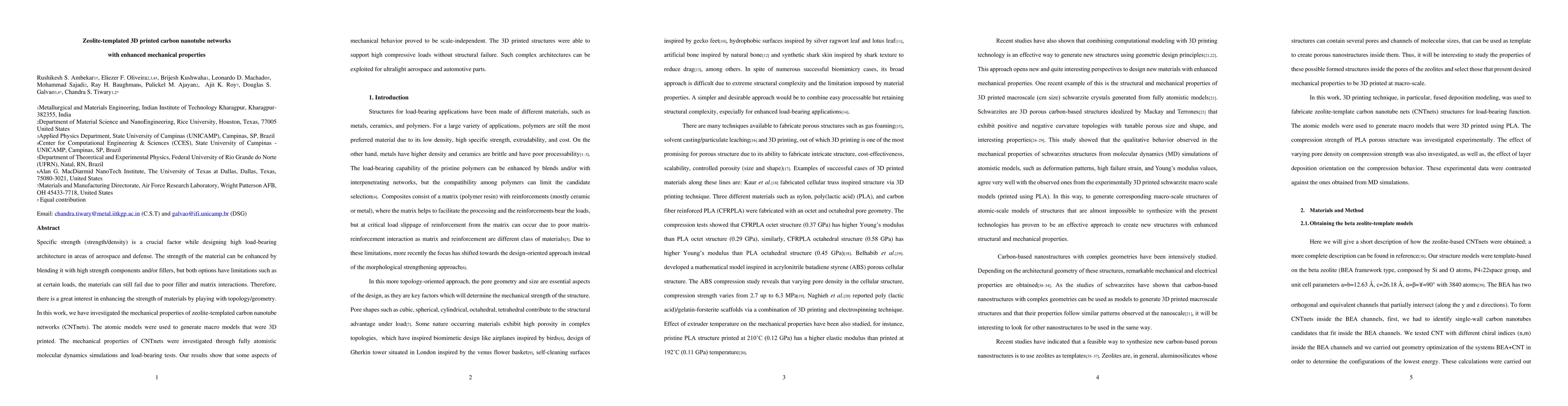 This research explores Zeolite-inspired 3D printed structures with enhanced mechanical properties, achieved by mimicking nature's complex topology. The study used molecular dynamics simulations to design structures, then 3D printed them, demonstrating improved load-bearing capacity with potential applications in aerospace and automotive industries for ultralight components.