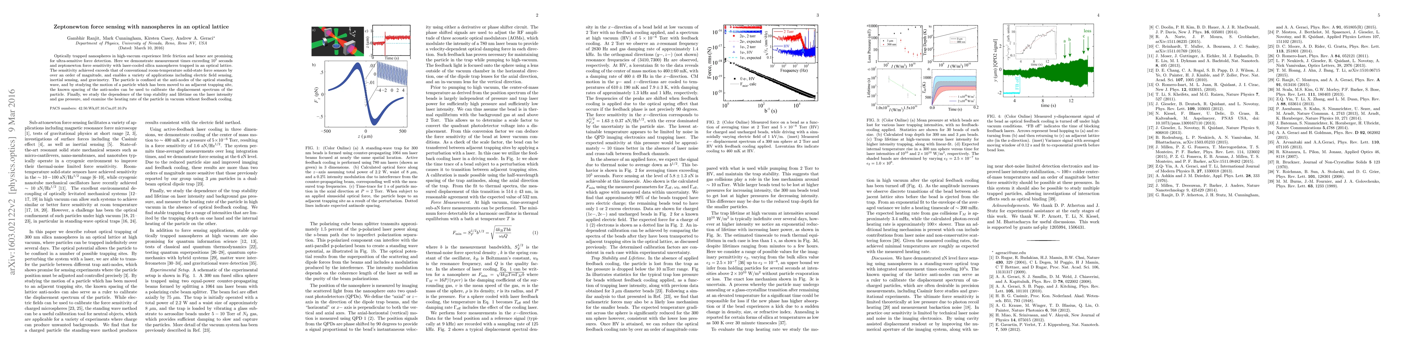 This paper demonstrates ultra-sensitive zeptonewton force detection using laser-cooled silica nanospheres trapped in an optical lattice, achieving measurement times over $10^5$ seconds and surpassing conventional solid-state sensors. The study also investigates the trap's stability and the particle's heating rate in high vacuum.