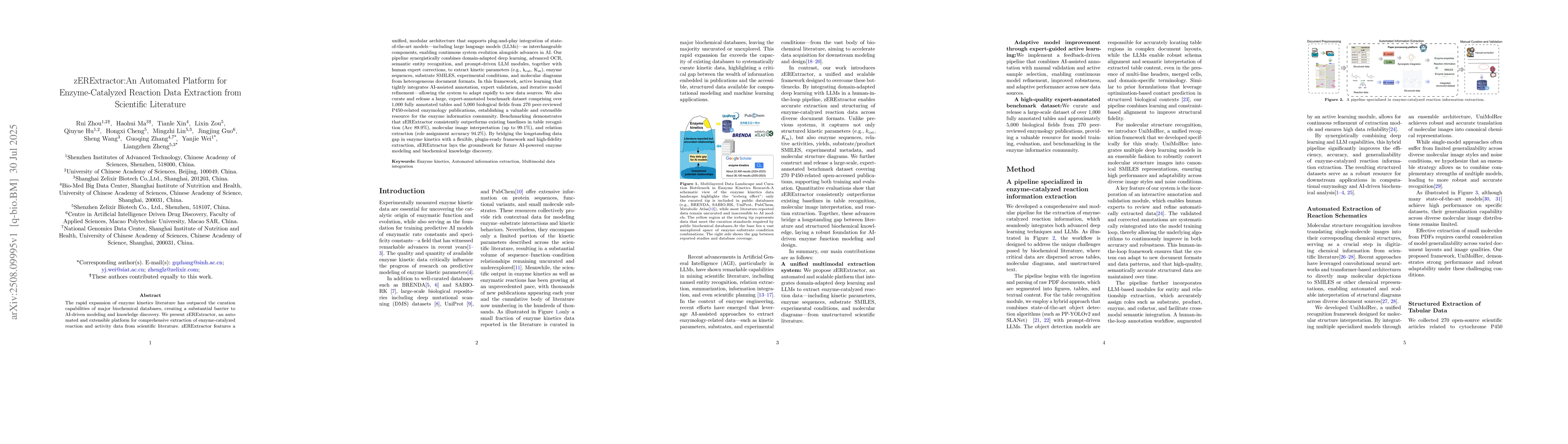 The rapid expansion of enzyme kinetics literature has outpaced the curation capabilities of major biochemical databases, creating a substantial barrier to AI-driven modeling and knowledge discovery. We present zERExtractor, an automated and extensible platform for comprehensive extraction of enzyme-catalyzed reaction and activity data from scientific literature. zERExtractor features a unified, modular architecture that supports plug-and-play integration of state-of-the-art models, including large language models (LLMs), as interchangeable components, enabling continuous system evolution alongside advances in AI. Our pipeline combines domain-adapted deep learning, advanced OCR, semantic entity recognition, and prompt-driven LLM modules, together with human expert corrections, to extract kinetic parameters (e.g., kcat, Km), enzyme sequences, substrate SMILES, experimental conditions, and molecular diagrams from heterogeneous document formats. Through active learning strategies integrating AI-assisted annotation, expert validation, and iterative refinement, the system adapts rapidly to new data sources. We also release a large benchmark dataset comprising over 1,000 annotated tables and 5,000 biological fields from 270 P450-related enzymology publications. Benchmarking demonstrates that zERExtractor consistently outperforms existing baselines in table recognition (Acc 89.9%), molecular image interpretation (up to 99.1%), and relation extraction (accuracy 94.2%). zERExtractor bridges the longstanding data gap in enzyme kinetics with a flexible, plugin-ready framework and high-fidelity extraction, laying the groundwork for future AI-powered enzyme modeling and biochemical knowledge discovery.
