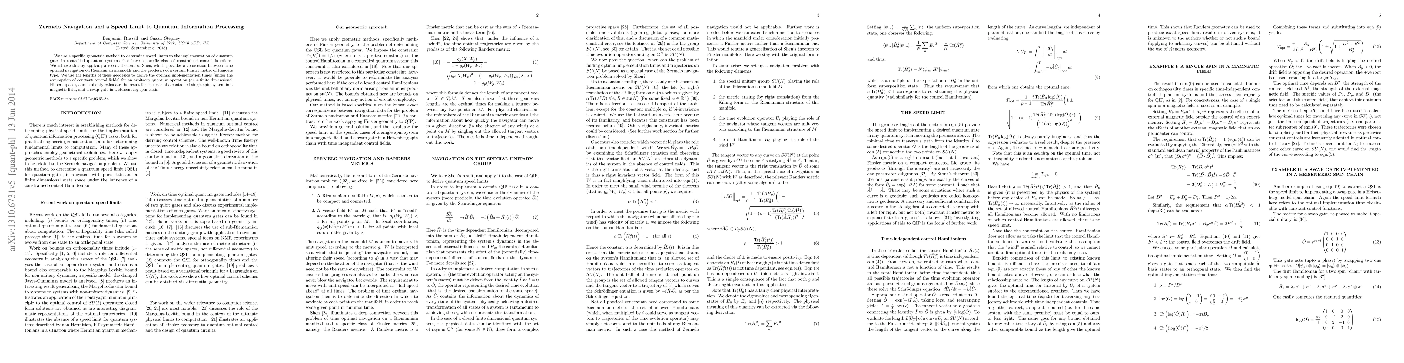 We use a specific geometric method to determine speed limits to the implementation of quantum gates in controlled quantum systems that have a specific class of constrained control functions. We achieve this by applying a recent theorem of Shen, which provides a connection between time optimal navigation on Riemannian manifolds and the geodesics of a certain Finsler metric of Randers type. We use the lengths of these geodesics to derive the optimal implementation times (under the assumption of constant control fields) for an arbitrary quantum operation (on a finite dimensional Hilbert space), and explicitly calculate the result for the case of a controlled single spin system in a magnetic field, and a swap gate in a Heisenberg spin chain.