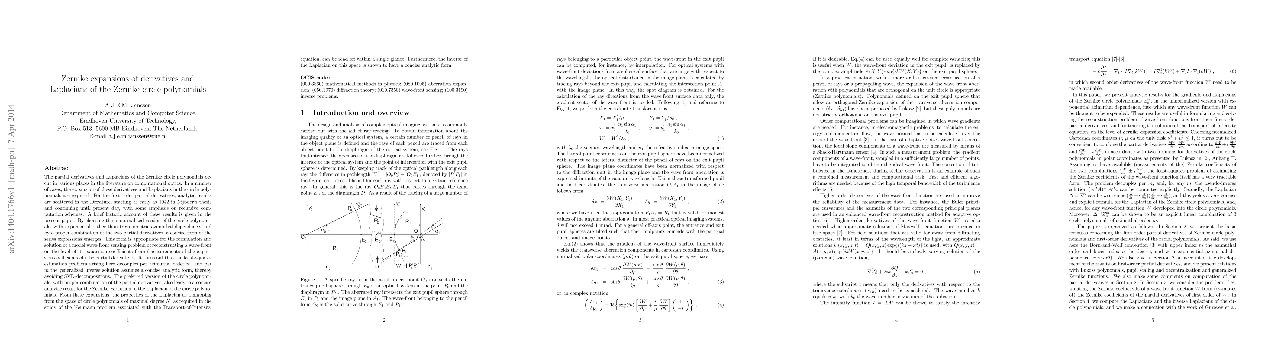 The partial derivatives and Laplacians of the Zernike circle polynomials occur in various places in the literature on computational optics. In a number of cases, the expansion of these derivatives and Laplacians in the circle polynomials are required. For the first-order partial derivatives, analytic results are scattered in the literature, starting as early as 1942 in Nijboer's thesis and continuing until present day, with some emphasis on recursive computation schemes. A brief historic account of these results is given in the present paper. By choosing the unnormalized version of the circle polynomials, with exponential rather than trigonometric azimuthal dependence, and by a proper combination of the two partial derivatives, a concise form of the series expressions emerges. This form is appropriate for the formulation and solution of a model wave-front sensing problem of reconstructing a wave-front on the level of its expansion coefficients from (measurements of the expansion coefficients of) the partial derivatives. It turns out that the least-squares estimation problem arising here decouples per azimuthal order $m$, and per $m$ the generalized inverse solution assumes a concise analytic form, thereby avoiding SVD-decompositions. The preferred version of the circle polynomials, with proper combination of the partial derivatives, also leads to a concise analytic result for the Zernike expansion of the Laplacian of the circle polynomials. From these expansions, the properties of the Laplacian as a mapping from the space of circle polynomials of maximal degree $N$, as required in the study of the Neumann problem associated with the Transport-of-Intensity equation, can be read off within a single glance. Furthermore, the inverse of the Laplacian on this space is shown to have a concise analytic form.