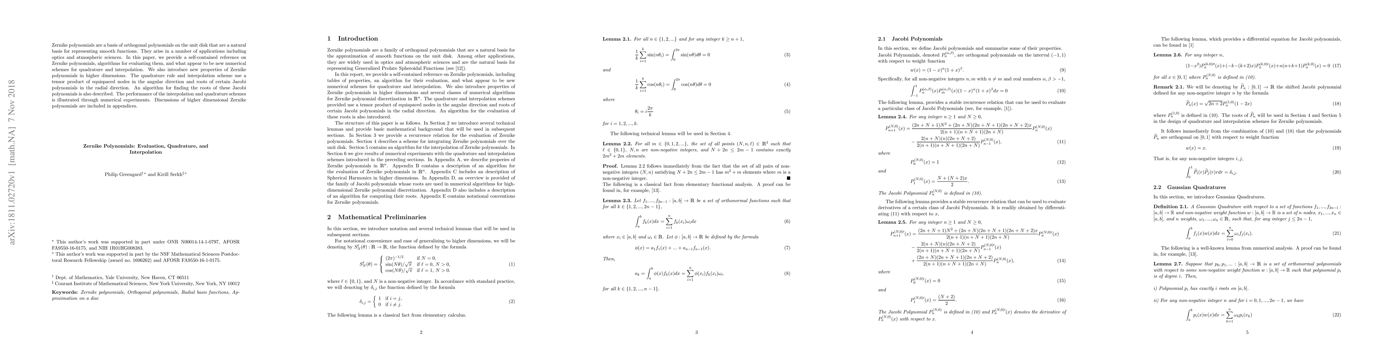 Zernike polynomials are a basis of orthogonal polynomials on the unit disk that are a natural basis for representing smooth functions. They arise in a number of applications including optics and atmospheric sciences. In this paper, we provide a self-contained reference on Zernike polynomials, algorithms for evaluating them, and what appear to be new numerical schemes for quadrature and interpolation. We also introduce new properties of Zernike polynomials in higher dimensions. The quadrature rule and interpolation scheme use a tensor product of equispaced nodes in the angular direction and roots of certain Jacobi polynomials in the radial direction. An algorithm for finding the roots of these Jacobi polynomials is also described. The performance of the interpolation and quadrature schemes is illustrated through numerical experiments. Discussions of higher dimensional Zernike polynomials are included in appendices.