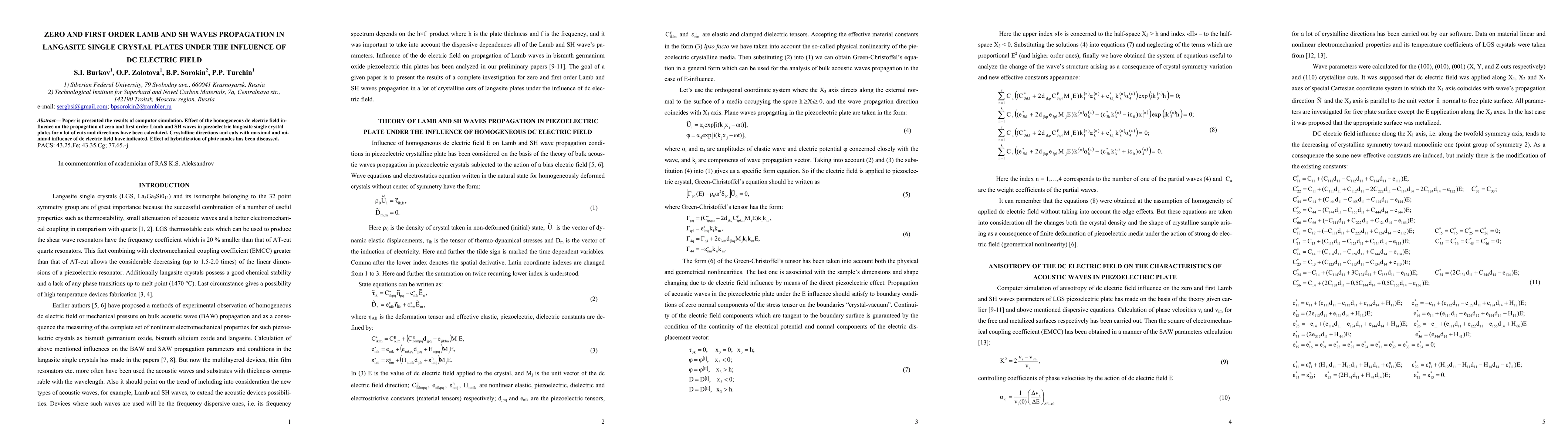 This paper presents computer simulations of zero and first order Lamb and SH wave propagation in langasite single crystal plates under a dc electric field, identifying optimal crystalline directions and cuts with maximal and minimal influence, and discussing the effects of mode hybridization.