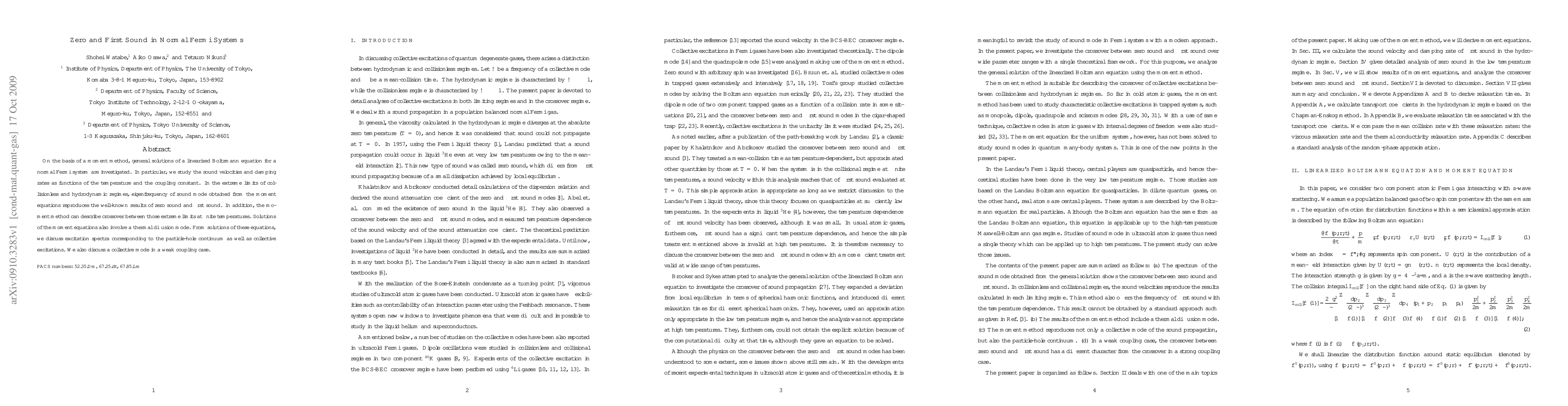 This paper investigates sound velocities and damping rates in normal Fermi systems using a moment method applied to a linearized Boltzmann equation. It identifies zero sound and first sound in extreme regimes and describes the crossover at finite temperatures, also discussing thermal diffusion and collective excitations.