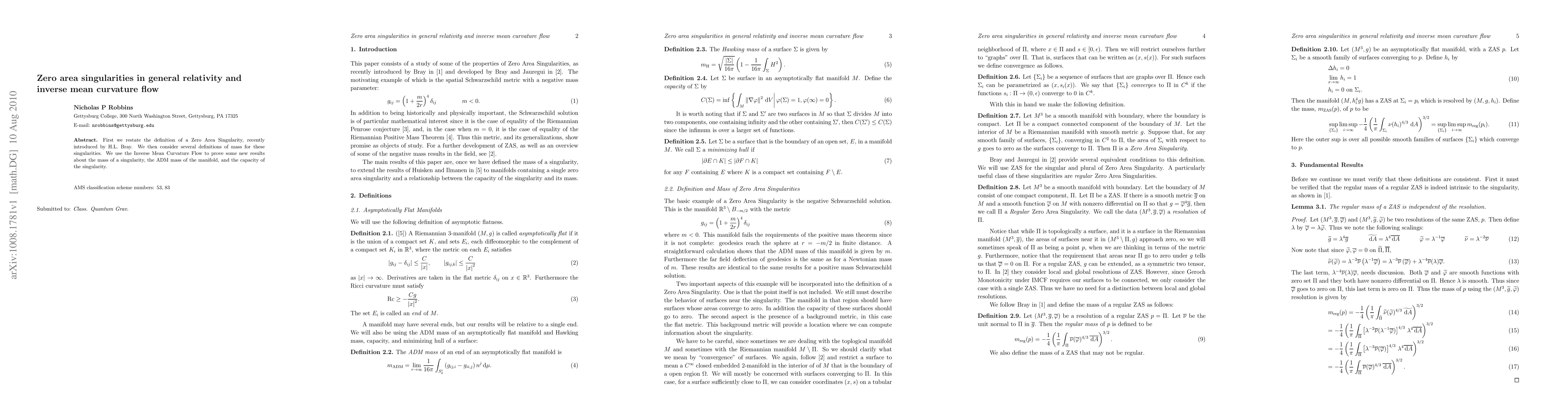 This paper explores Zero Area Singularities in general relativity, refining H. Bray's definition. Utilizing Inverse Mean Curvature Flow, it presents new findings on singularity mass, ADM mass of the manifold, and singularity capacity, contributing to our understanding of gravitational phenomena.