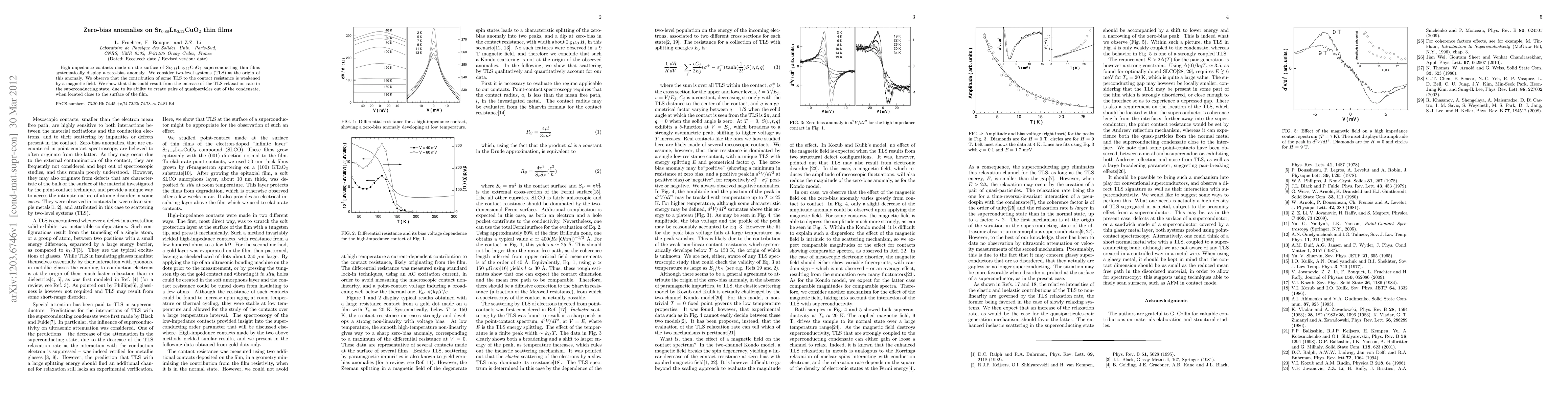 The research identifies zero-bias anomalies in Sr$_{0.88}$La$_{0.12}$CuO$_2$ superconducting thin films, attributing them to Two-Level Systems (TLS). These TLS weaken under magnetic fields, likely due to increased relaxation rates that disrupt the superconducting condensate near the film's surface.