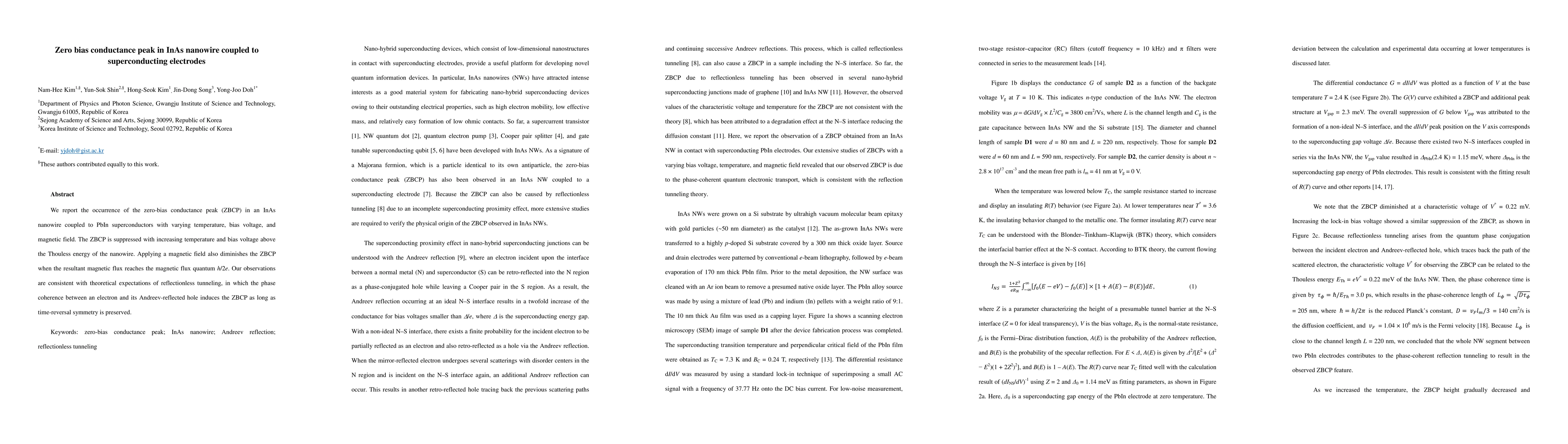 The study reports the occurrence of a zero-bias conductance peak (ZBCP) in InAs nanowires coupled to PbIn superconductors, which is suppressed with increasing temperature, bias voltage, and magnetic field. The ZBCP's behavior aligns with theoretical predictions of reflectionless tunneling due to phase coherence between electrons and their Andreev-reflected counterparts.