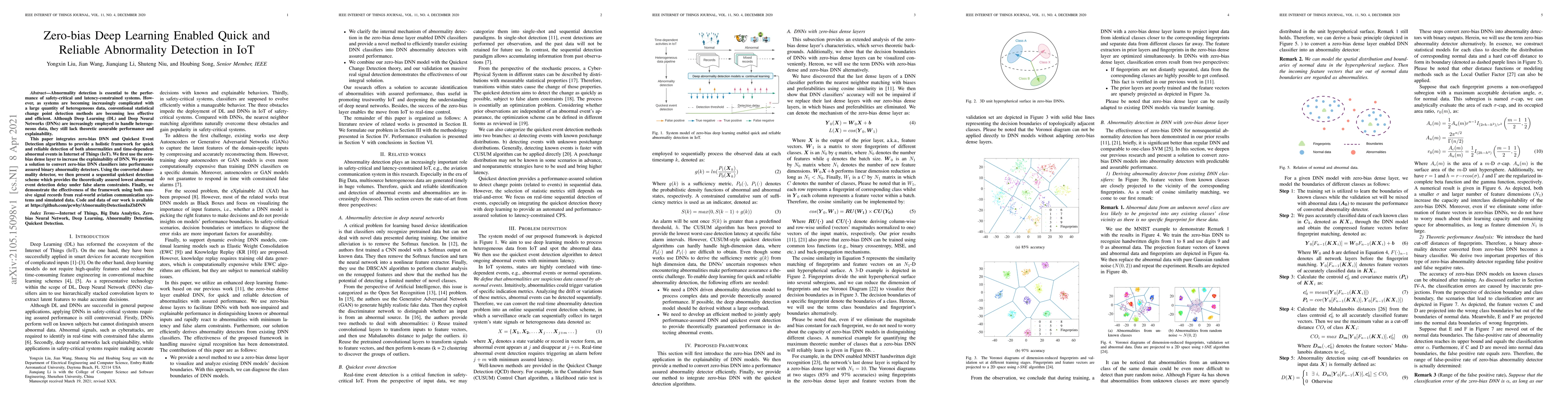 Abnormality detection is essential to the performance of safety-critical and latency-constrained systems. However, as systems are becoming increasingly complicated with a large quantity of heterogeneous data, conventional statistical change point detection methods are becoming less effective and efficient. Although Deep Learning (DL) and Deep Neural Networks (DNNs) are increasingly employed to handle heterogeneous data, they still lack theoretic assurable performance and explainability. This paper integrates zero-bias DNN and Quickest Event Detection algorithms to provide a holistic framework for quick and reliable detection of both abnormalities and time-dependent abnormal events in the Internet of Things (IoT). We first use the zero-bias dense layer to increase the explainability of DNN. We provide a solution to convert zero-bias DNN classifiers into performance assured binary abnormality detectors. Using the converted abnormality detector, we then present a sequential quickest detection scheme that provides the theoretically assured lowest abnormal event detection delay under false alarm constraints. Finally, we demonstrate the effectiveness of the framework using both massive signal records from real-world aviation communication systems and simulated data. Code and data of our work is available at \url{https://github.com/pcwhy/AbnormalityDetectionInZbDNN}