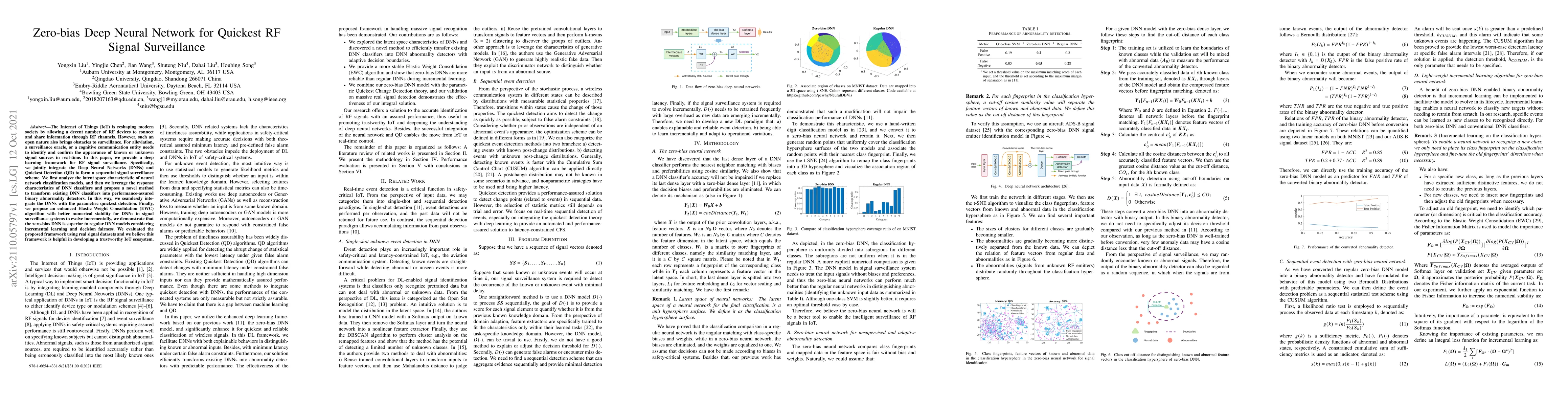 This paper presents a deep learning framework combining Deep Neural Networks (DNNs) and Quickest Detection (QD) for real-time RF signal surveillance in IoT. It introduces a zero-bias DNN method for transforming DNN classifiers into reliable abnormality detectors, enhancing Elastic Weight Consolidation for incremental learning, and demonstrates superior performance over regular DNN models.
