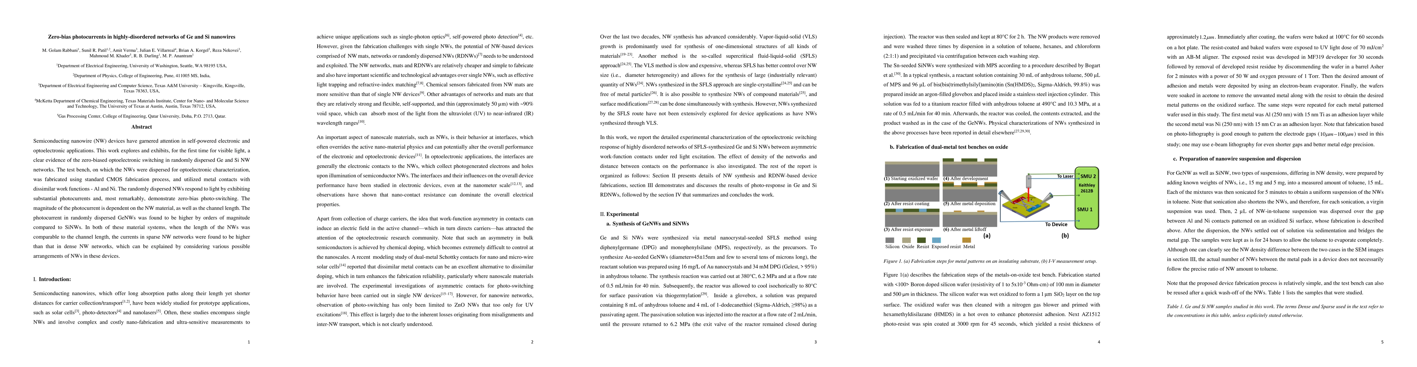 Semiconducting nanowire (NW) devices have garnered attention in self-powered electronic and optoelectronic applications. This work explores and exhibits, for the first time for visible light, a clear evidence of the zero-biased optoelectronic switching in randomly dispersed Ge and Si NW networks. The test bench, on which the NWs were dispersed for optoelectronic characterization, was fabricated using standard CMOS fabrication process, and utilized metal contacts with dissimilar work functions - Al and Ni. The randomly dispersed NWs respond to light by exhibiting substantial photocurrents and, most remarkably, demonstrate zero-bias photo-switching. The magnitude of the photocurrent is dependent on the NW material, as well as the channel length. The photocurrent in randomly dispersed GeNWs was found to be higher by orders of magnitude compared to SiNWs. In both of these material systems, when the length of the NWs was comparable to the channel length, the currents in sparse NW networks were found to be higher than that in dense NW networks, which can be explained by considering various possible arrangements of NWs in these devices.