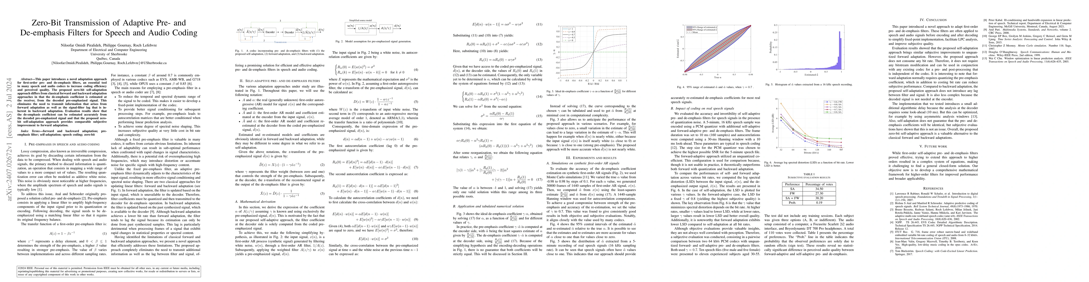 This paper proposes a zero-bit adaptation method for pre- and de-emphasis filters in speech and audio codecs, estimating the de-emphasis coefficient at the receiver from the decoded pre-emphasized signal, eliminating the need for additional information transmission and reducing signal-filter lag. Evaluations show it provides comparable subjective quality improvement to traditional adaptation methods.