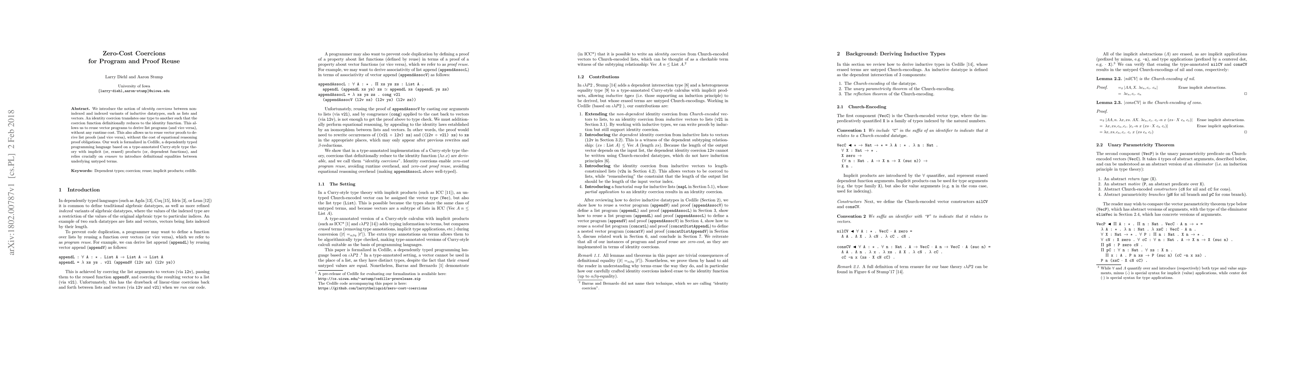 This paper introduces identity coercions for transforming non-indexed and indexed datatypes like lists and vectors, enabling program and proof reuse without runtime costs or proof obligations. The methodology is formalized in Cedille, leveraging dependent types and erasure to establish definitional equalities.
