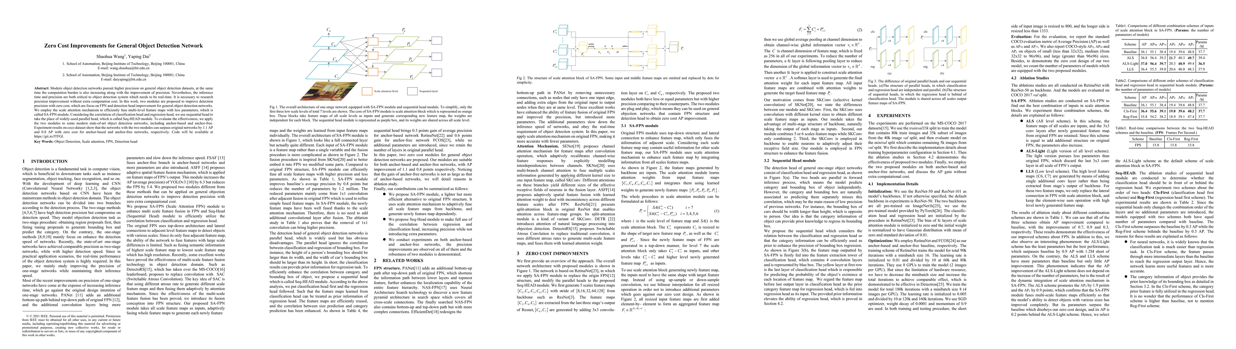 Modern object detection networks pursuit higher precision on general object detection datasets, at the same time the computation burden is also increasing along with the improvement of precision. Nevertheless, the inference time and precision are both critical to object detection system which needs to be real-time. It is necessary to research precision improvement without extra computation cost. In this work, two modules are proposed to improve detection precision with zero cost, which are focus on FPN and detection head improvement for general object detection networks. We employ the scale attention mechanism to efficiently fuse multi-level feature maps with less parameters, which is called SA-FPN module. Considering the correlation of classification head and regression head, we use sequential head to take the place of widely-used parallel head, which is called Seq-HEAD module. To evaluate the effectiveness, we apply the two modules to some modern state-of-art object detection networks, including anchor-based and anchor-free. Experiment results on coco dataset show that the networks with the two modules can surpass original networks by 1.1 AP and 0.8 AP with zero cost for anchor-based and anchor-free networks, respectively. Code will be available at https://git.io/JTFGl.
