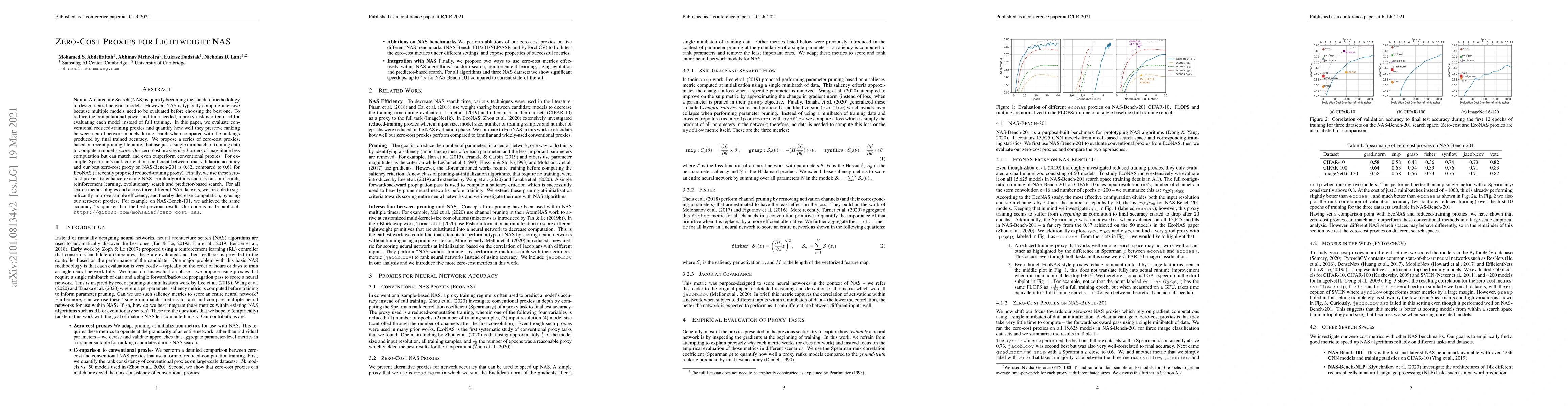 This paper proposes zero-cost proxies for Neural Architecture Search (NAS) that require only a single minibatch of training data, significantly reducing computational costs by three orders of magnitude while maintaining or surpassing the accuracy of conventional reduced-training proxies. The authors demonstrate improved sample efficiency across various NAS search algorithms, achieving the same accuracy four times faster than previous methods.