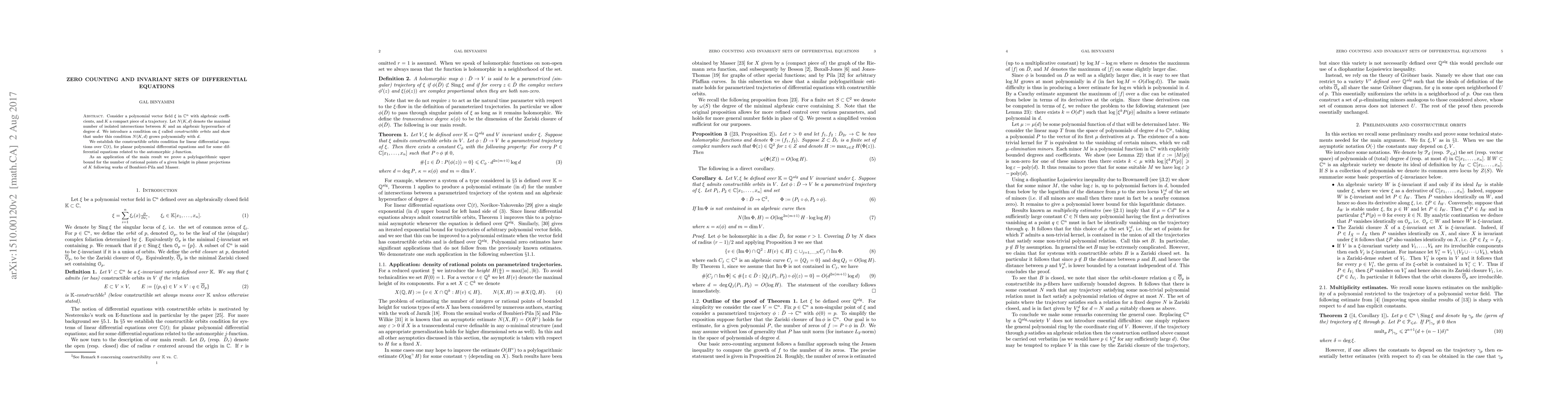 Consider a polynomial vector field $\xi$ in $\mathbb{C}^n$ with algebraic coefficients, and $K$ a compact piece of a trajectory. Let $N(K,d)$ denote the maximal number of isolated intersections between $K$ and an algebraic hypersurface of degree $d$. We introduce a condition on $\xi$ called \emph{constructible orbits} and show that under this condition $N(K,d)$ grows polynomially with $d$. We establish the constructible orbits condition for linear differential equations over $\mathbb{C}(t)$, for planar polynomial differential equations and for some differential equations related to the automorphic $j$-function. As an application of the main result we prove a polylogarithmic upper bound for the number of rational points of a given height in planar projections of $K$ following works of Bombieri-Pila and Masser.