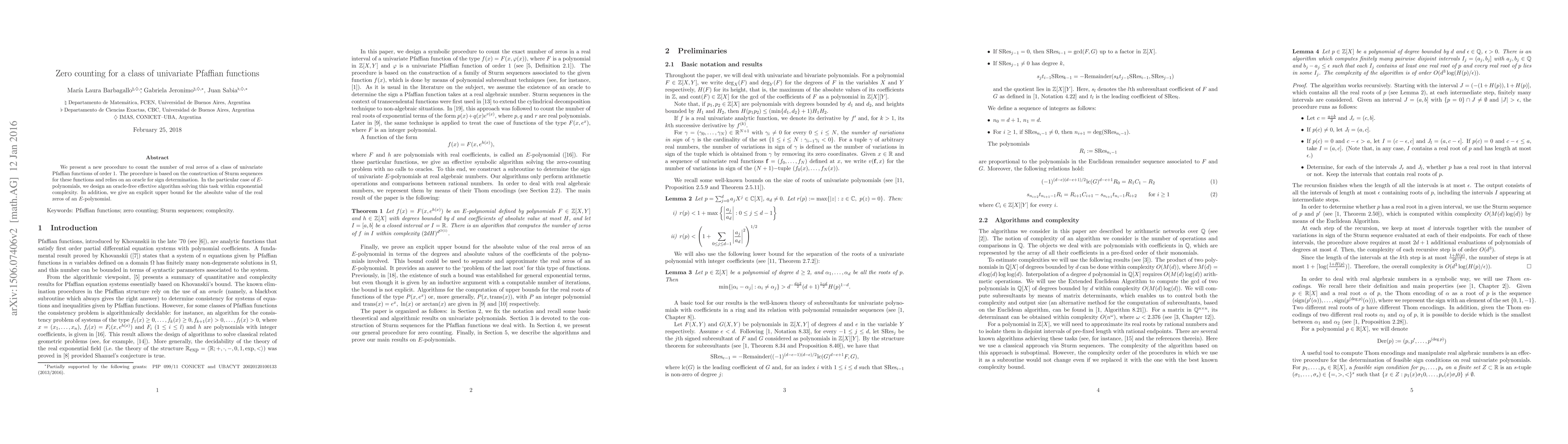 We present a new procedure to count the number of real zeros of a class of univariate Pfaffian functions of order $1$. The procedure is based on the construction of Sturm sequences for these functions and relies on an oracle for sign determination. In the particular case of $E$-polynomials, we design an oracle-free effective algorithm solving this task within exponential complexity. In addition, we give an explicit upper bound for the absolute value of the real zeros of an $E$-polynomial.