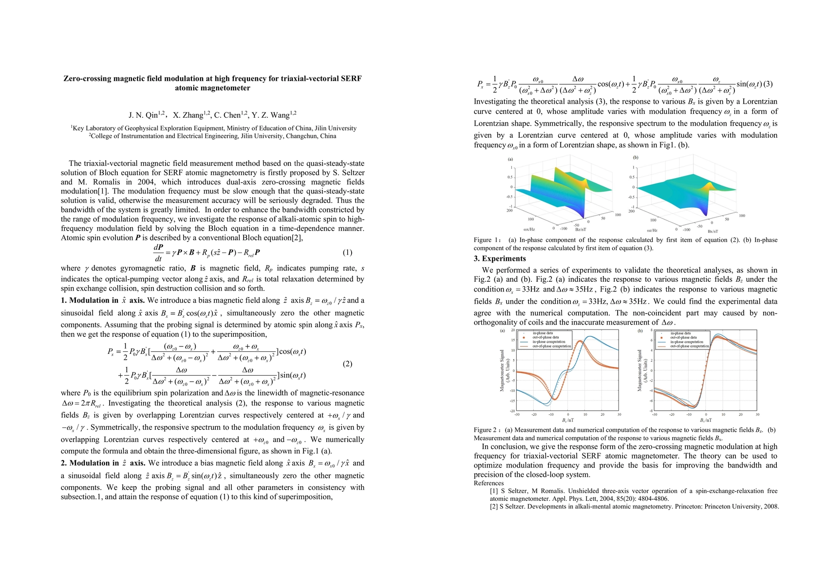 The triaxial-vectorial magnetic field measurement method based on the quasi-steady-state solution of Bloch equation for SERF atomic magnetometry is firstly proposed by S. Seltzer and M. Romalis in 2004, which introduces dual-axis zero-crossing magnetic fields modulation. The modulation frequency must be slow enough that the quasi-steady-state solution is valid, otherwise the measurement accuracy will be seriously degraded. Thus the bandwidth of the system is greatly limited. In order to enhance the bandwidth constricted by the range of modulation frequency, we investigate the response of alkali-atomic spin to high-frequency modulation field by solving the Bloch equation in a time-dependence manner.