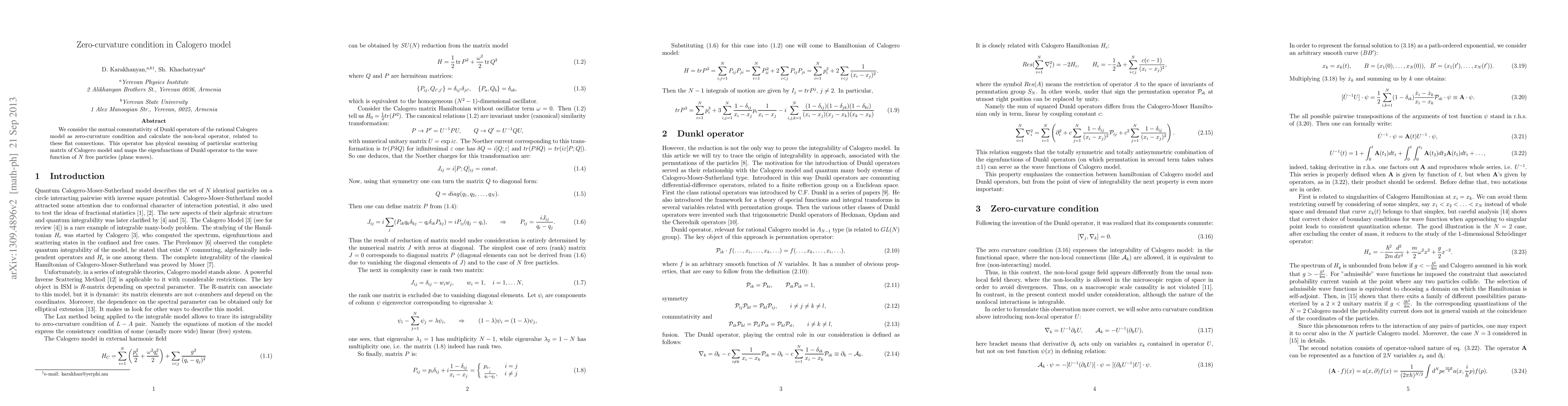 We consider the mutual commutativity of Dunkl operators of the rational Calogero model as zero-curvature condition and calculate the non-local operator, related to these flat connections. This operator has physical meaning of particular scattering matrix of Calogero model and maps the eigenfunctions of Dunkl operator to the wave function of $N$ free particles (plane waves).