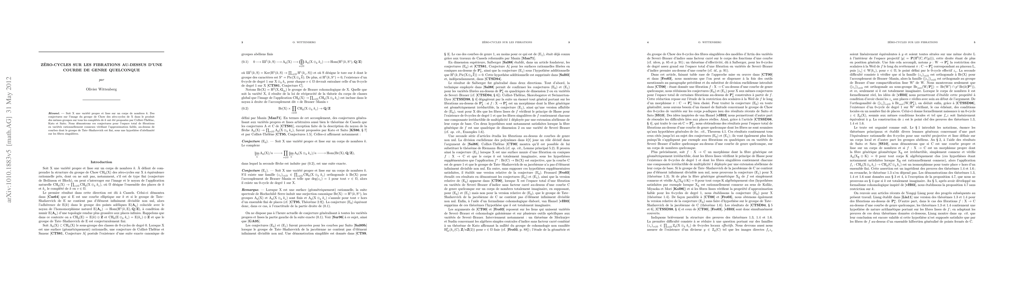 Let X be a smooth and proper variety over a number field k. Conjectures on the image of the Chow group of zero-cycles of X in the product of the corresponding groups over all completions of k were put forward by Colliot-Th\'el\`ene, Kato and Saito. We prove these conjectures for the total space of fibrations, over curves with finite Tate-Shafarevich group, into rationally connected varieties which satisfy weak approximation, under an abelianness assumption on the singular fibers. ---- Soit X une vari\'et\'e propre et lisse sur un corps de nombres k. Des conjectures sur l'image du groupe de Chow des z\'ero-cycles de X dans le produit des m\^emes groupes sur tous les compl\'et\'es de k ont \'et\'e propos\'ees par Colliot-Th\'el\`ene, Kato et Saito. Nous d\'emontrons ces conjectures pour l'espace total de fibrations en vari\'et\'es rationnellement connexes v\'erifiant l'approximation faible, au-dessus de courbes dont le groupe de Tate-Shafarevich est fini, sous une hypoth\`ese d'ab\'elianit\'e sur les fibres singuli\`eres.